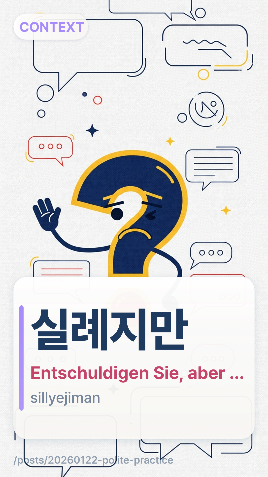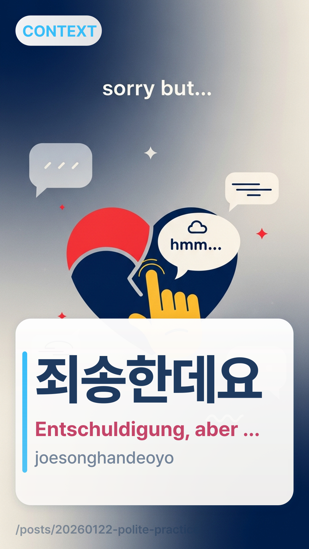 Letzte Woche in einem KakaoTalk-Arbeitsgruppenchat sah ich, wie ein jüngerer Teamkollege mit 죄송한데요joesonghandeyo um eine schnelle Änderung bat – und die Stimmung blieb freundlich statt angespannt. Fünf Minuten später schickte mir jemand per DM einen Screenshot aus einem Café: Ein Kunde begann mit 실례지만silryejiman, bevor er fragte, ob er den Platz tauschen dürfe. Gleiche Stimmung: höflich, nicht aufdringlich und sehr „koreanisch-natürlich“ in gesprochenen Nachrichten.