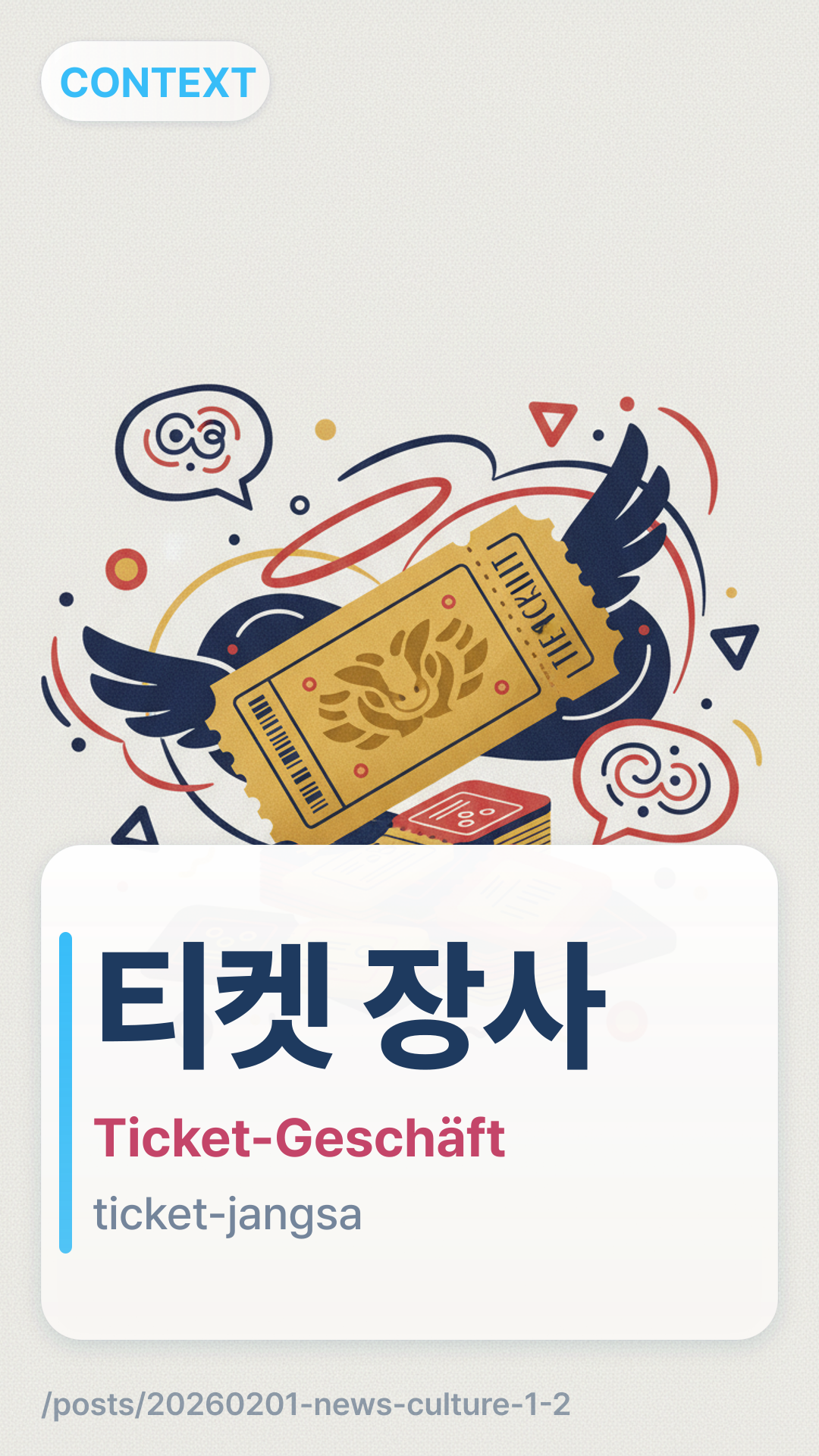 티켓 장사tiket jangsa (ticket-jangsa) bedeutet wörtlich „Ticket-Geschäft“ oder „Verkauf von Tickets mit Gewinnabsicht“. Im politischen Kontext ist es ein abwertender Begriff, mit dem jemandem vorgeworfen wird, eine Veranstaltung zu nutzen, um Geld von Unterstützern zu extrahieren, anstatt für echte Kommunikation.