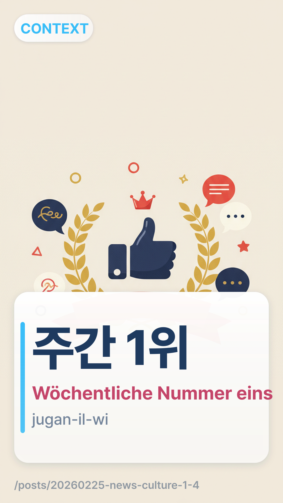 주간 1위jugan 1wi (jugan-il-wi) bezieht sich darauf, "Nummer 1 in den Wochencharts" zu sein. Es ist eine Kombination aus 주간jugan (wöchentlich) und 1위1wi (erster Platz/Rang). Sie werden diesen Begriff ständig in Nachrichten über K-Pop-Musikshows, Einspielergebnisse an den Kinokassen und Streaming-Rankings sehen.