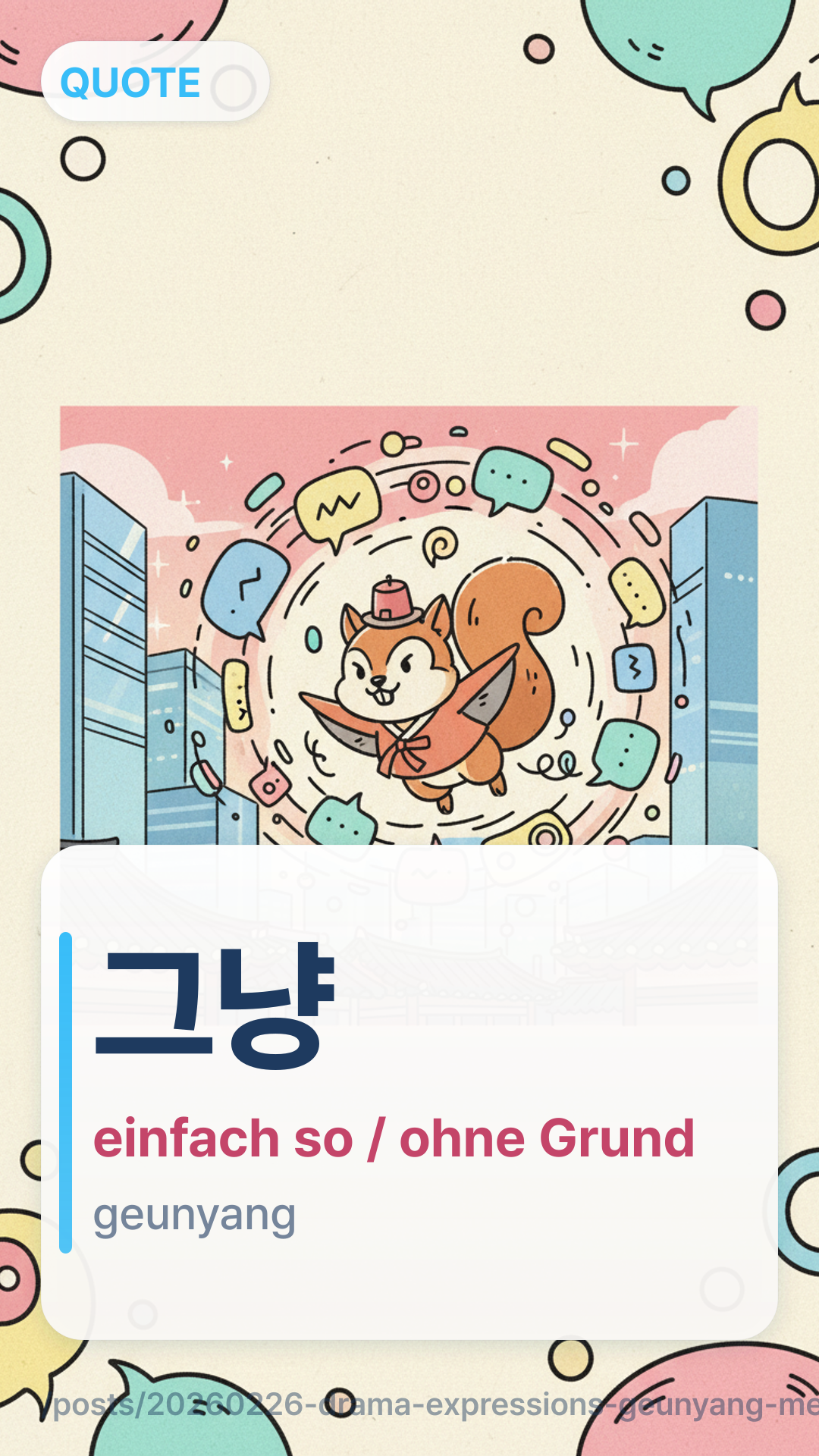 In seiner Wörterbuchform bedeutet 그냥geunyang „so wie es ist“ oder „ohne Änderung“. In der Konversation fungiert es jedoch als Gesprächsschild. Es ist der ultimative Weg, eine Frage abzuwehren, ohne explizit unhöflich zu sein. Wenn jemand fragt „Warum?“ und man seine komplexen Emotionen nicht erklären möchte, übernimmt 그냥geunyang die schwere Arbeit.