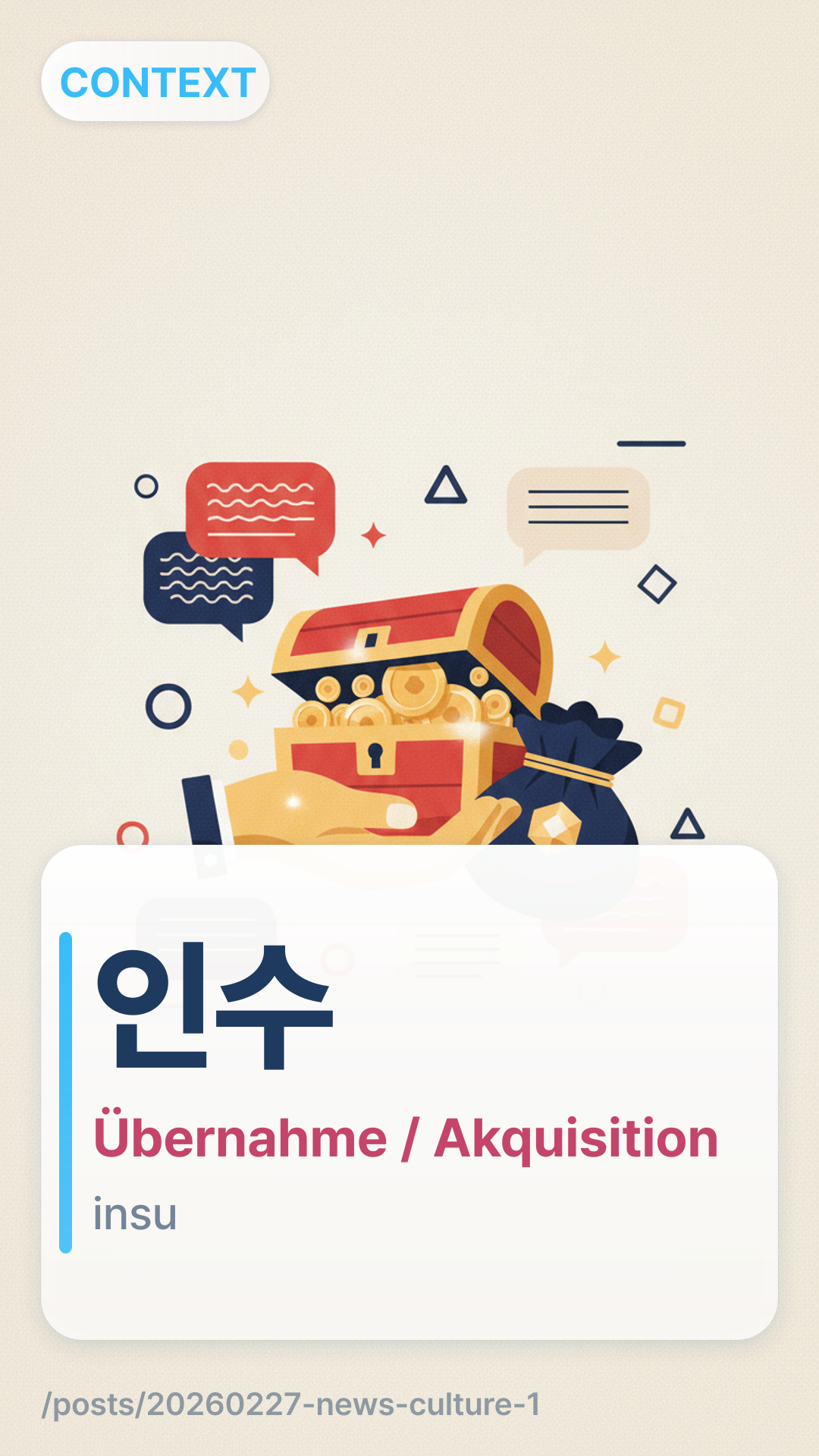 Im Kontext dieser Nachrichten bezieht sich 인수insu (insu) auf die Übernahme oder Akquisition eines Unternehmens. Es wird oft mit 합병hapbyeong (hapbyeong - Fusion) kombiniert, um den Begriff M&A (인수합병) zu bilden.