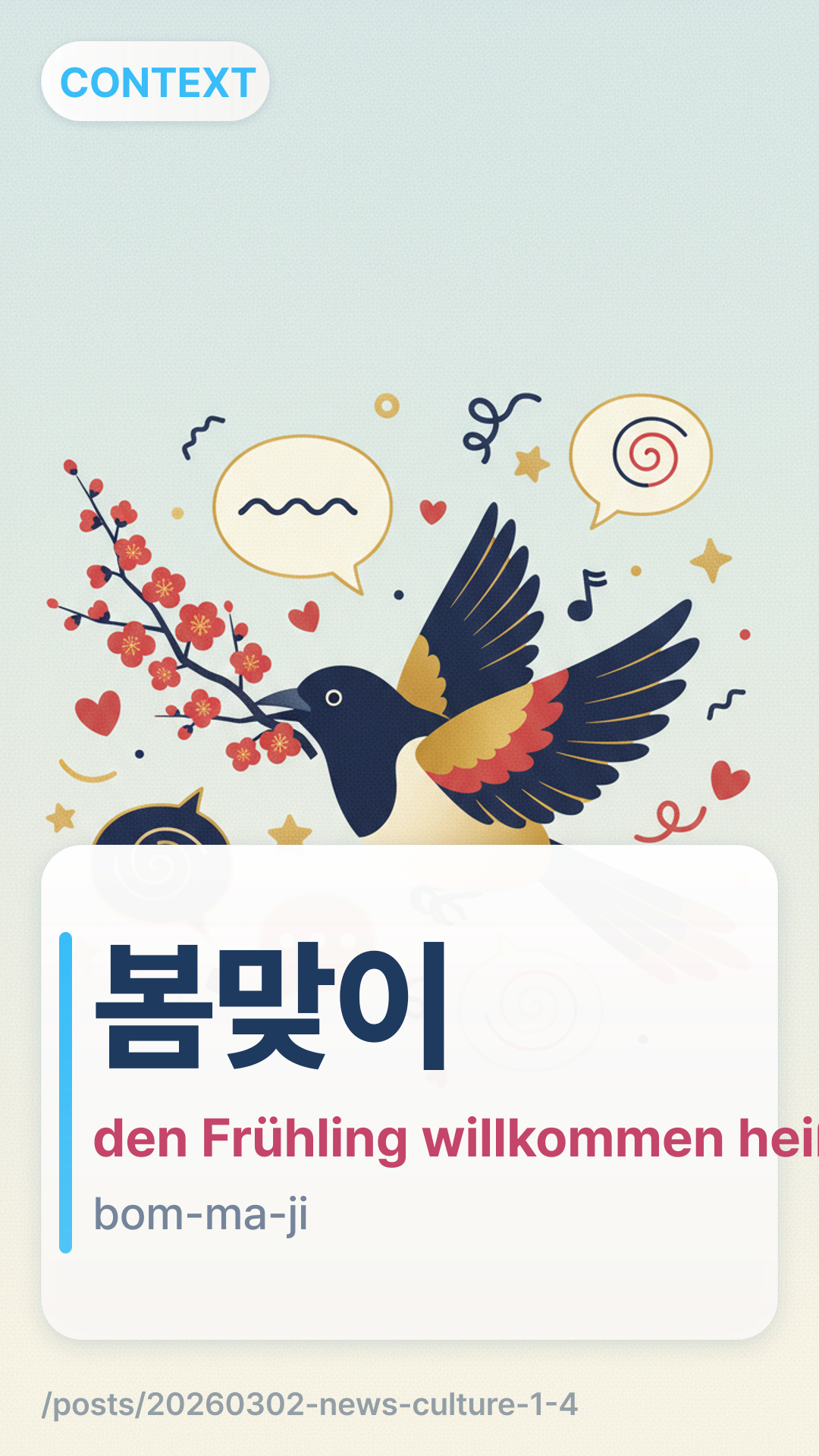 봄맞이bommaji (bom-ma-ji) bezieht sich auf den Akt des Grüßens oder Willkommenheißens der Frühlingssaison. Es ist eine Kombination aus 봄bom (Frühling) und 맞이maji (Begrüßung/Begegnung). Es wird oft im Zusammenhang mit Putzen, dem Kauf neuer Kleidung oder dem Besuch von Festen verwendet, um das Ende des Winters zu feiern.