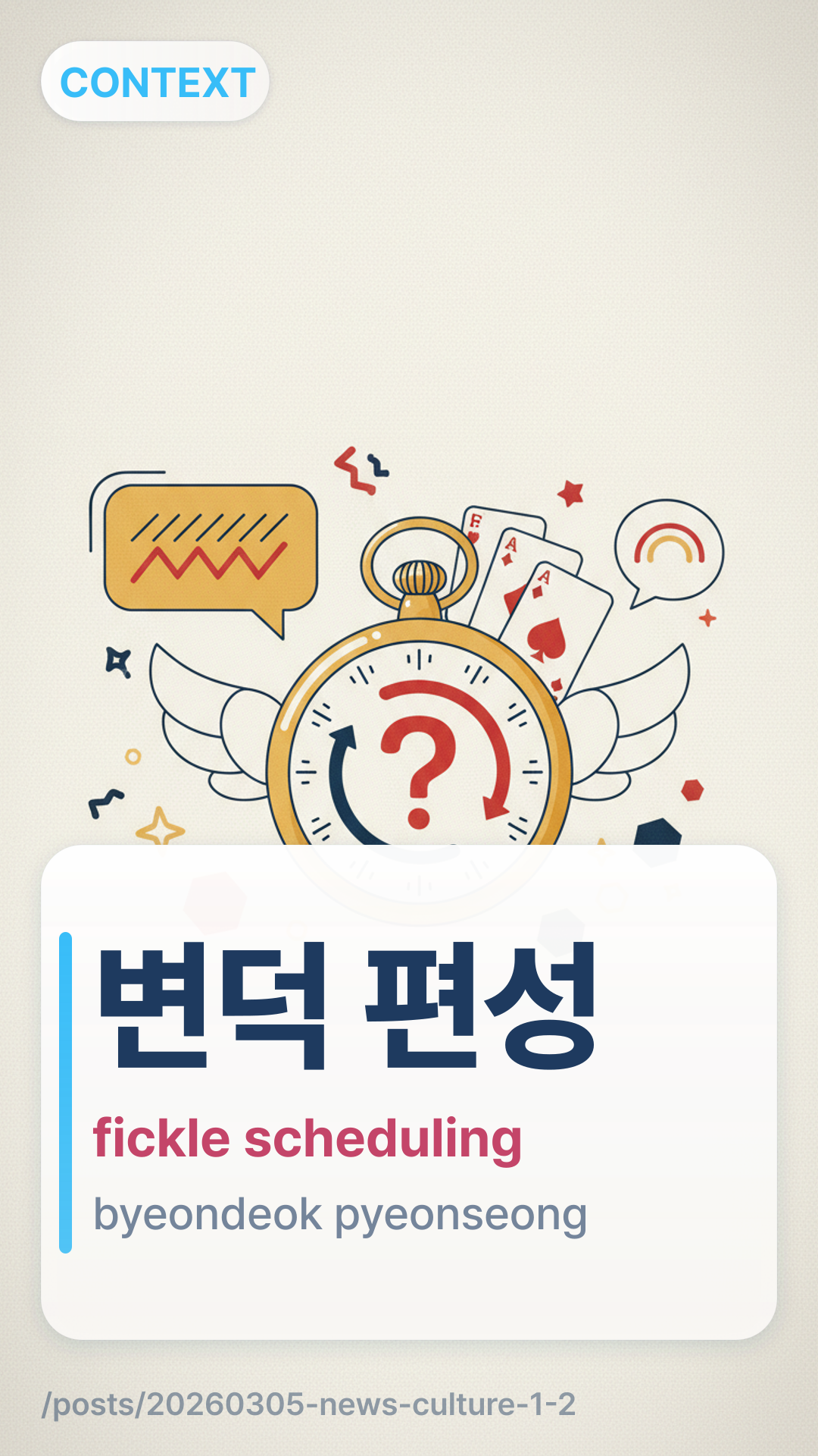 변덕 편성byeondeok pyeonseong (Byeondeok Pyeonseong) bezieht sich auf die Praxis eines Fernsehsenders, die Sendezeit häufig zu ändern oder eine geplante Sendung ohne große Vorankündigung abzusagen. Es setzt sich zusammen aus 변덕byeondeok (Launenhaftigkeit/Wankelmut) und 편성pyeonseong (Programmgestaltung/Planung).