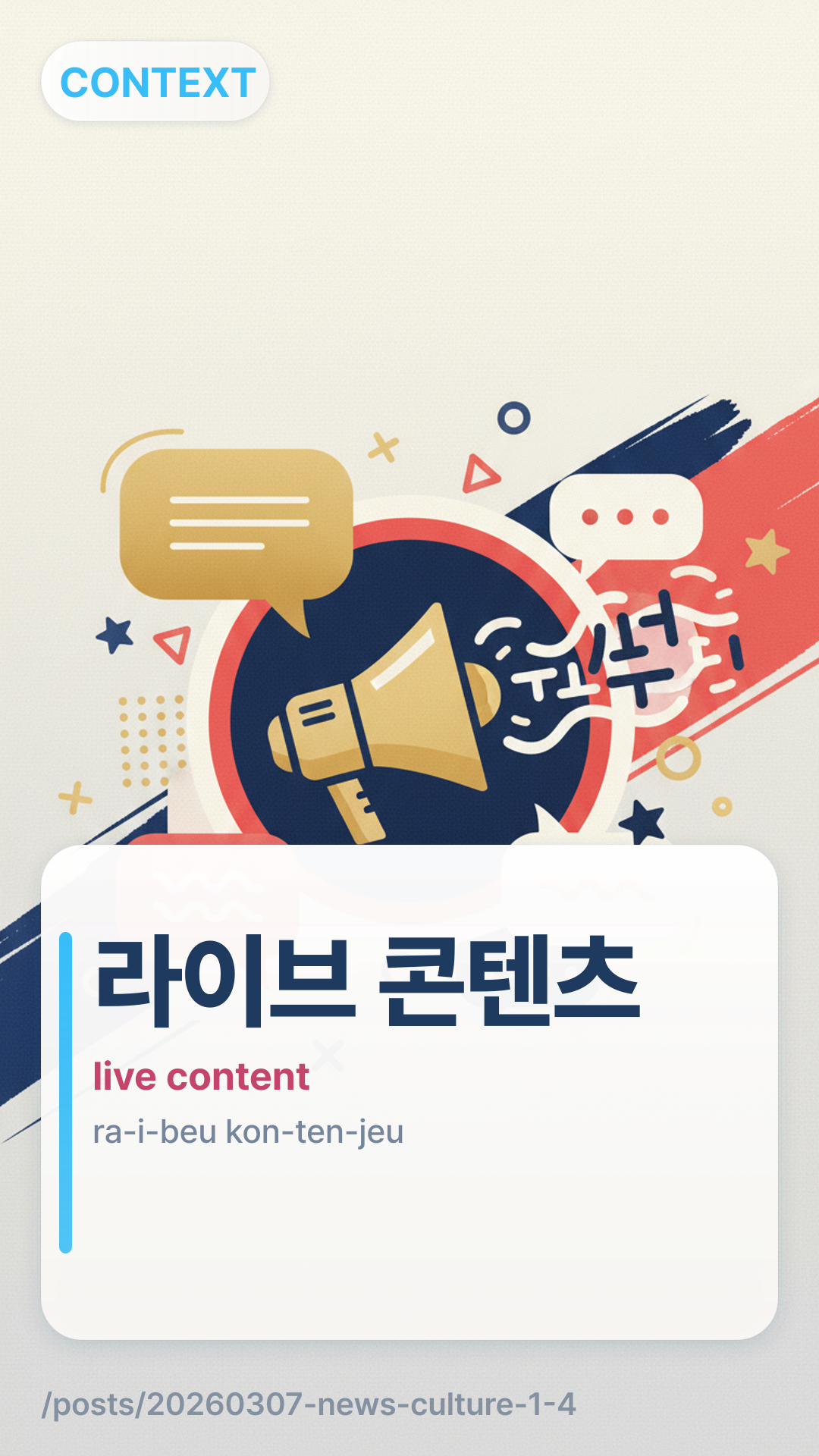 라이브 콘텐츠raibeu kontencheu (Live Content) bezieht sich auf Medien, die in Echtzeit über das Internet übertragen werden, wie Sportspiele, Konzerte oder Talkshows, anstatt vorab aufgezeichnet und für eine spätere Betrachtung bearbeitet zu werden.