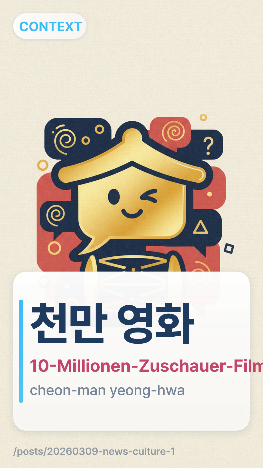 한국에서 천만 영화는 단순한 흥행 이상의 의미가 있습니다.hangugeseo cheonman yeonghwaneun dansunhan heunghaeng isaui uimiga itseupnida. — In Korea bedeutet ein 10-Millionen-Zuschauer-Film mehr als nur Erfolg an den Kinokassen.