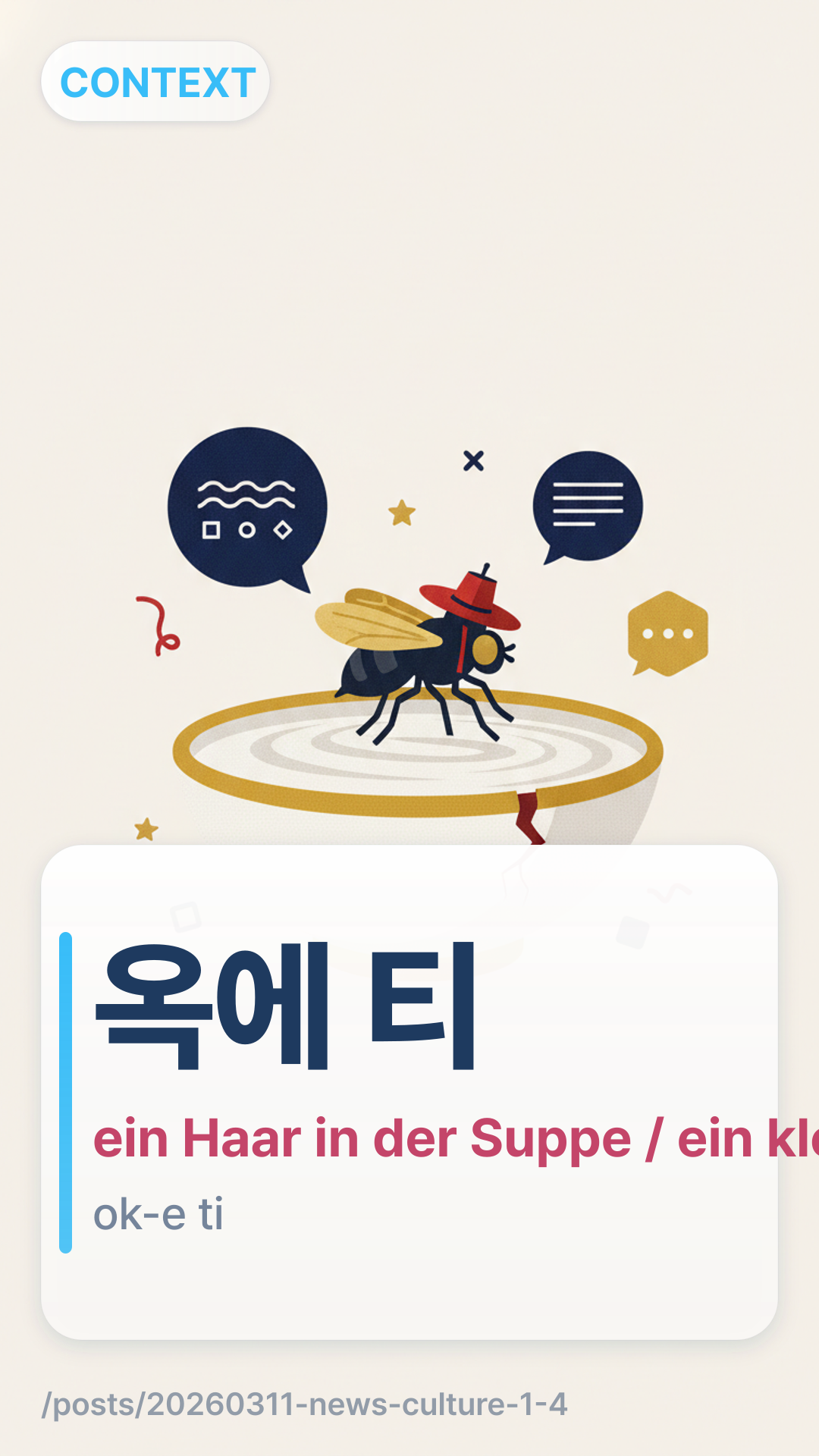 In der Schlagzeile wird der Ausdruck 옥에 티oge ti verwendet, um das Tiger-CG zu beschreiben. Wörtlich übersetzt bedeutet es 'ein Fleck in der Jade'. Es bezieht sich auf einen kleinen Fehler oder Makel in einem ansonsten perfekten oder schönen Objekt bzw. einer Situation.