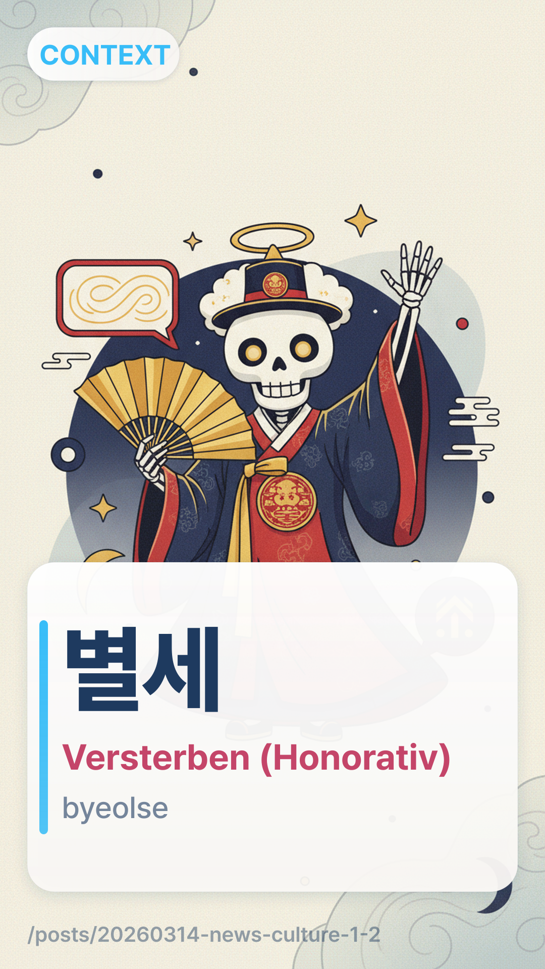 In koreanischen Nachrichten, insbesondere in Bezug auf angesehene Persönlichkeiten oder ältere Menschen, sieht man das Wort 별세byeolse (byeolse) anstelle des gewöhnlichen Wortes für Tod. Es ist eine höchst formelle und respektvolle Art zu sagen, dass jemand "verstorben" ist oder "diese Welt verlassen hat".