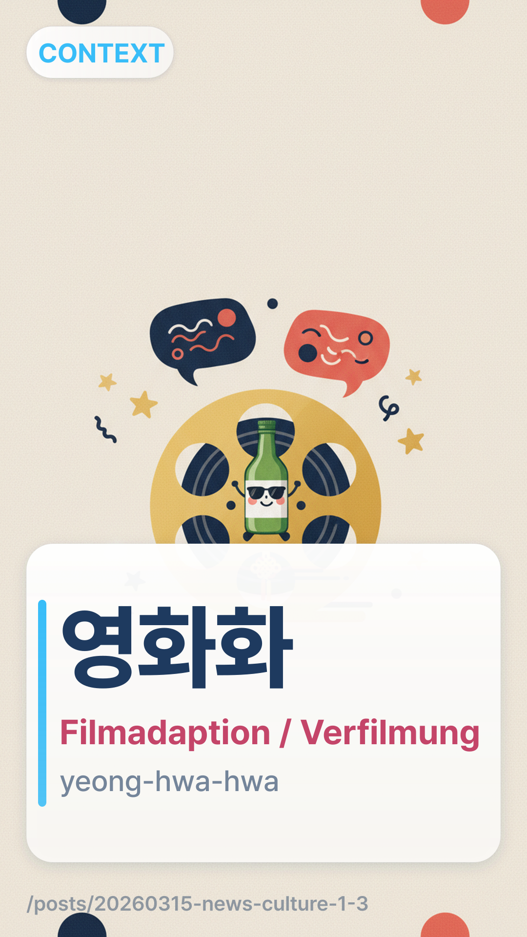 영화화yeonghwahwa (yeong-hwa-hwa) bezieht sich auf den Prozess der Adaption eines Buches, Webtoons oder einer wahren Geschichte in einen Spielfilm (Filmadaption).