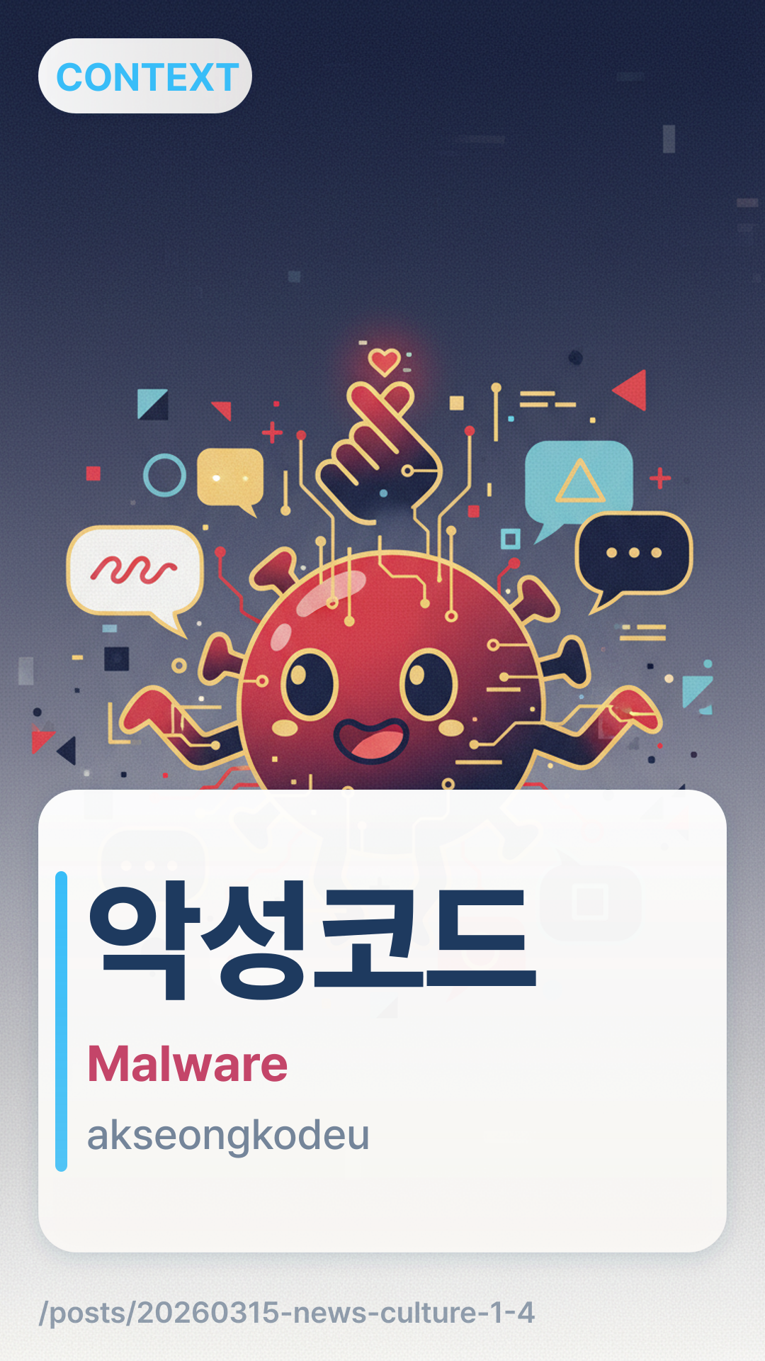 악성코드akseongkodeu (Ak-seong-ko-deu) bezieht sich auf 'Bösartigen Code' oder 'Malware'. Es ist eine Zusammensetzung aus '악성' (bösartig/böswillige Natur) und dem Lehnwort '코드' (Code). In koreanischen Nachrichten ist es der Standardbegriff für jede Software, die darauf ausgelegt ist, ein Computersystem zu beschädigen oder unbefugten Zugriff darauf zu erlangen.