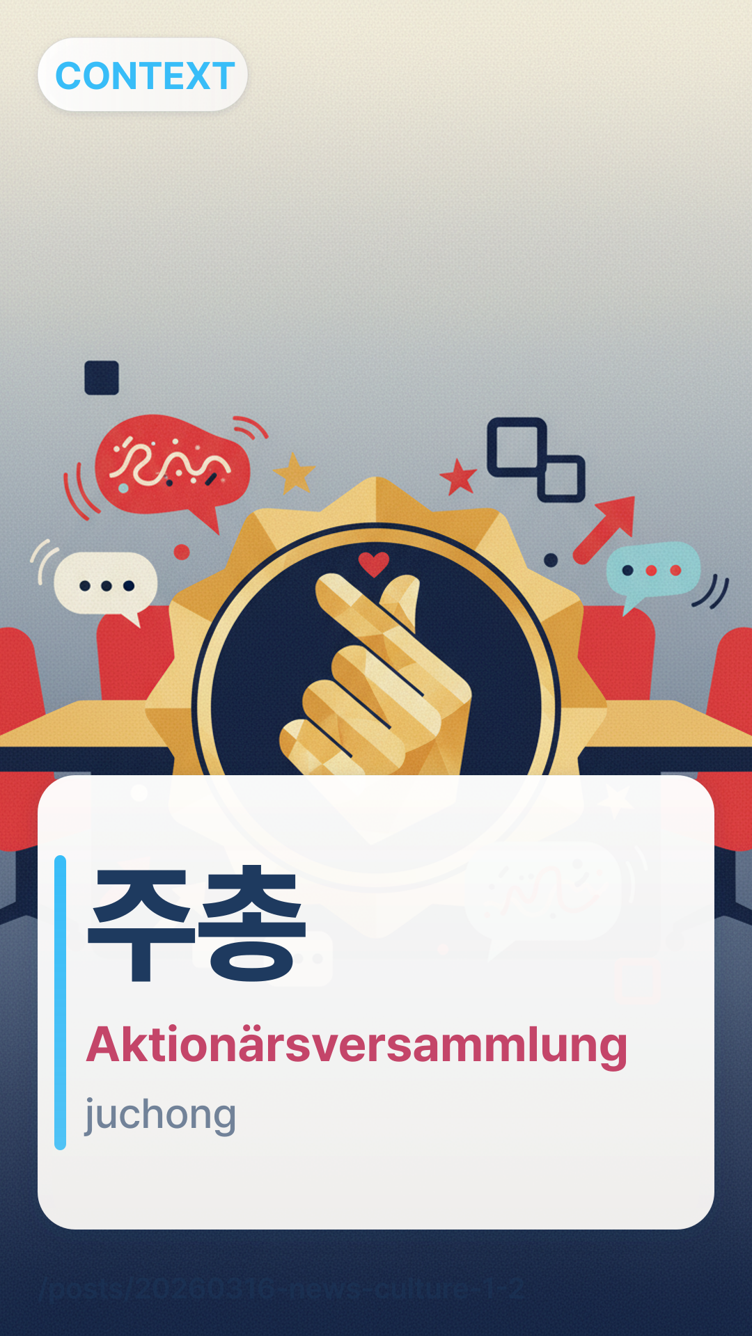 주총juchong (Ju-chong) ist eine Abkürzung für 주주총회jujuchonghoe (Ju-ju-chong-hoe), was Jahreshauptversammlung (AGM) der Aktionäre bedeutet. In Korea wird es „Super Ju-chong Season“ genannt, wenn viele große Unternehmen diese Versammlungen in derselben Woche abhalten.