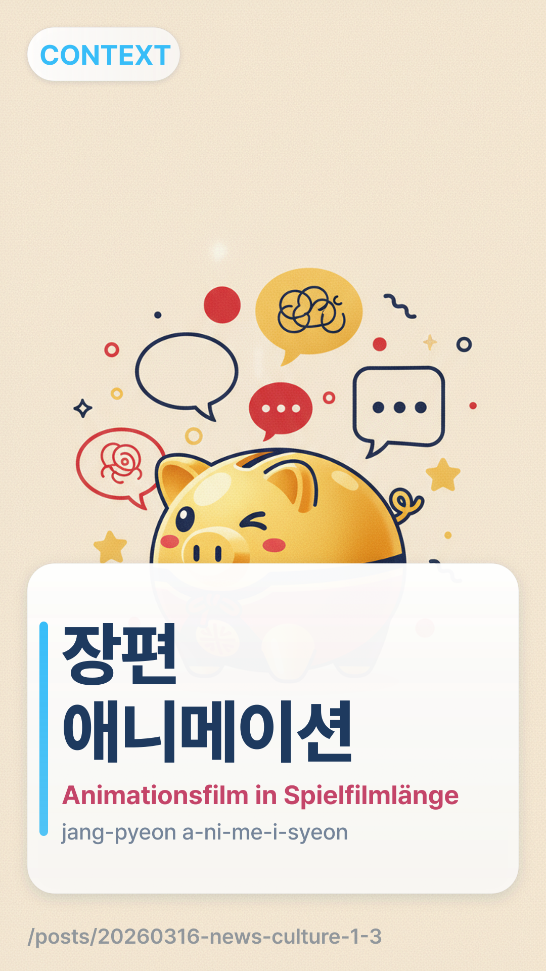 In koreanischen Nachrichtenberichten über das Kino werden Sie häufig den Begriff 장편 애니메이션jangpyeon aenimeisyeon (jang-pyeon a-ni-me-i-syeon) sehen. Dies bezieht sich speziell auf einen „Animationsfilm in Spielfilmlänge“ oder „Animated Feature Film“. Das Wort 장편jangpyeon (jang-pyeon) bedeutet Langform oder volle Länge, im Gegensatz zu 단편danpyeon (dan-pyeon), was einen Kurzfilm bedeutet.