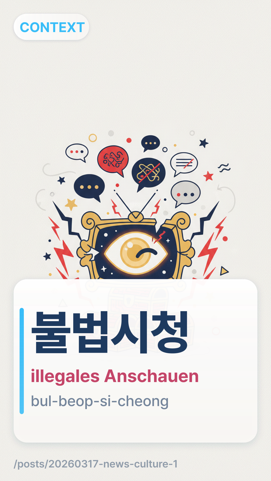 불법시청bulbeopsicheong (bul-beop-si-cheong) bezieht sich auf 'illegales Anschauen' oder 'unbefugtes Streaming'. Es kombiniert '불법' (illegal) und '시청' (Anschauen/Betrachten). Dieser Begriff wird häufig in Nachrichtenberichten verwendet, in denen es um Piraterie und Urheberrechtsverletzungen im digitalen Zeitalter geht.