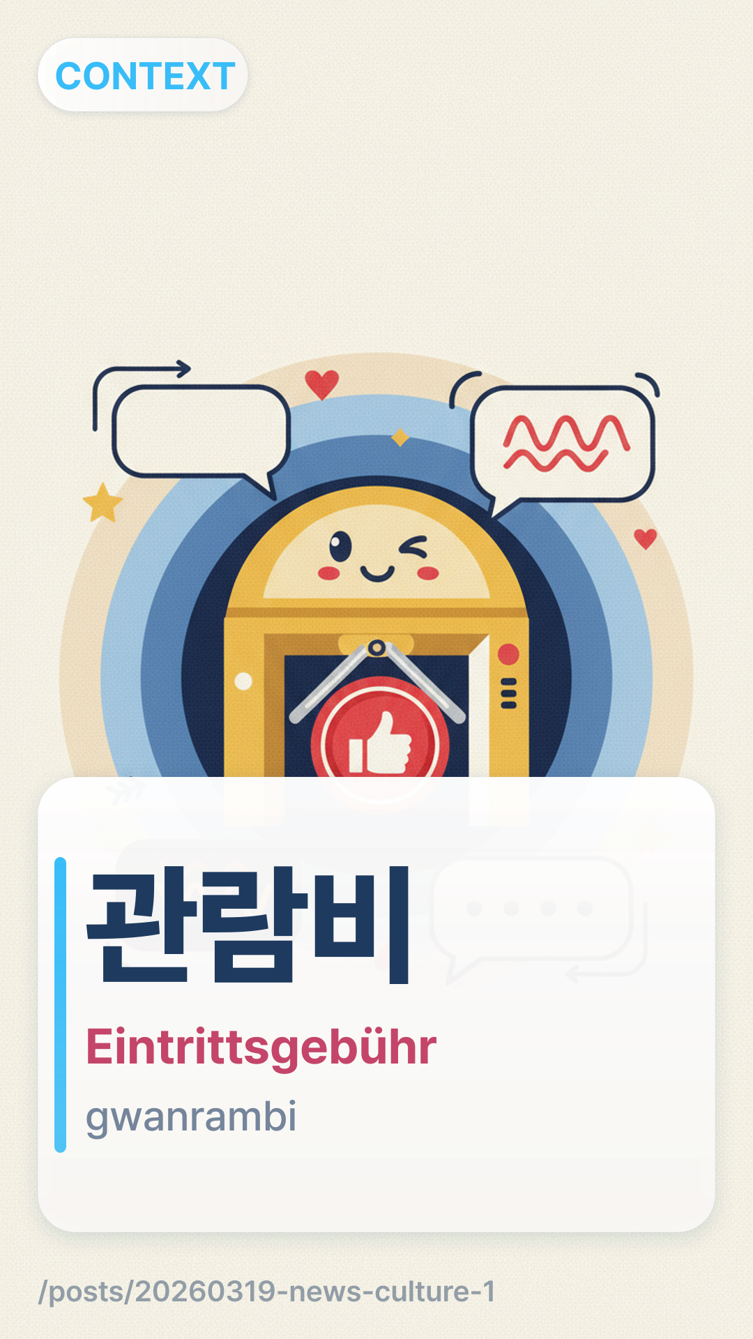 관람비gwanrambi (Gwan-ram-bi) bezieht sich auf die Eintrittsgebühr oder die Kosten für das Ansehen einer Aufführung, eines Films oder einer Ausstellung. Es ist ein Kompositum aus 관람gwanram (Besichtigung/Zuschauen) und 비bi (Gebühr/Ausgabe). Im Kontext der Nachrichten hebt es speziell die steigenden Kosten für Kinotickets hervor, die die Öffentlichkeit derzeit abschrecken.