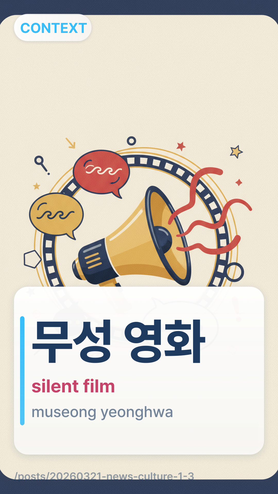 무성 영화museong yeonghwa (museong yeonghwa) bezieht sich auf „Stummfilme“. Vor den späten 1920er Jahren hatten Filme keinen synchronisierten Ton oder hörbare Dialoge. In Korea wurden diese Vorführungen oft von einem 변사byeonsa (byeonsa) begleitet, einem Live-Erzähler, der die Handlung beschrieb und den Charakteren seine Stimme lieh.