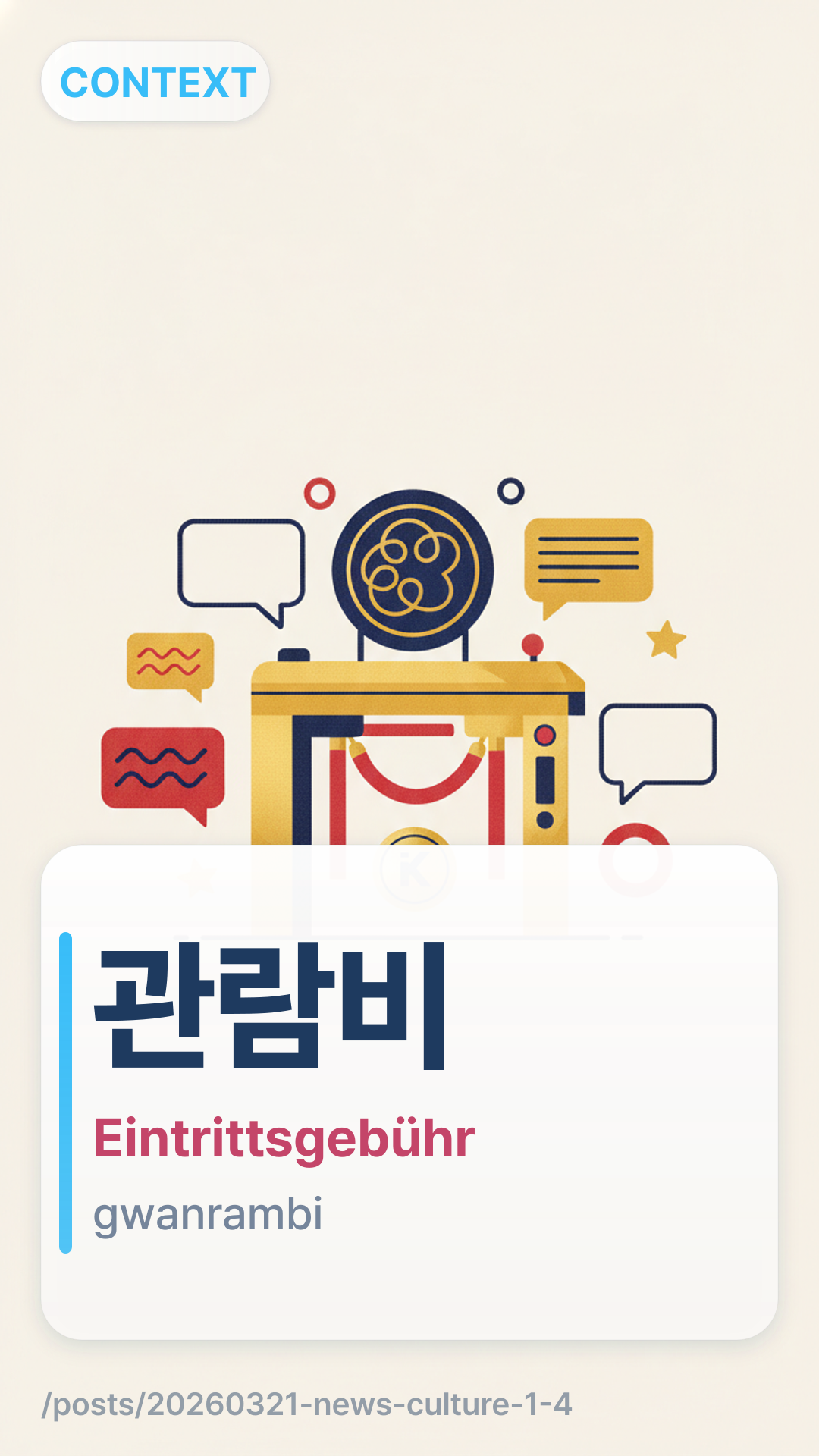 관람비gwanrambi (Gwan-ram-bi) bezieht sich auf die Eintrittsgebühr oder die Besichtigungskosten für eine Aufführung, einen Film oder eine Ausstellung. Es kombiniert 관람gwanram (Besichtigung/Zuschauen) und 비bi (Gebühr/Kosten). Im Kontext der Nachrichten weist es speziell auf die steigenden Kosten für Kinokarten hin, die das Publikum abschrecken.