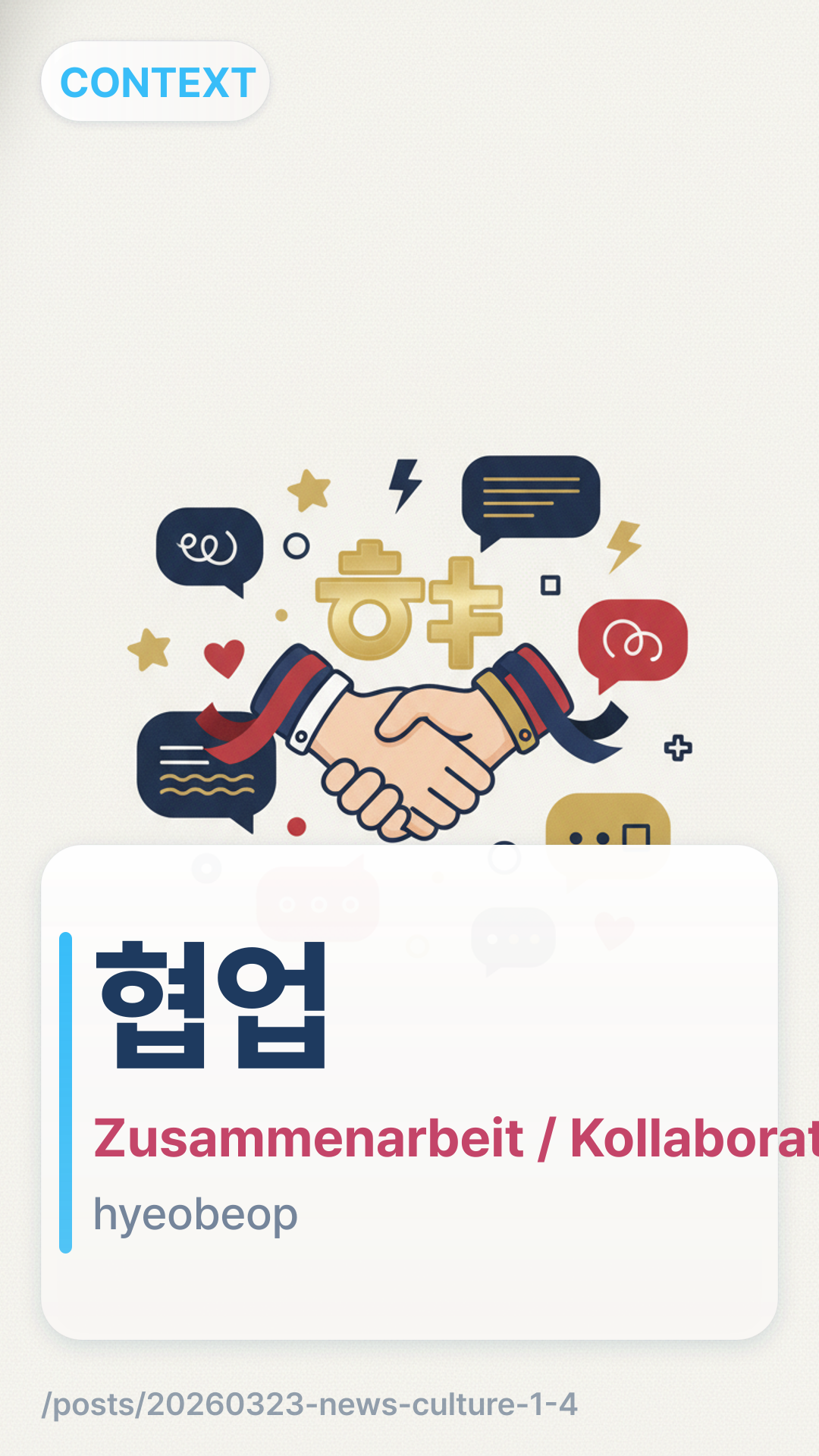 협업hyeobeop (hyeobeop) bezieht sich auf 'Zusammenarbeit' oder 'Kooperation', insbesondere wenn zwei verschiedene Einheiten oder Einzelpersonen an einem gemeinsamen Projekt arbeiten, um ein gemeinsames Ziel zu erreichen. Im geschäftlichen Kontext wird es oft für 'Marken-Kollaborationen' verwendet.
