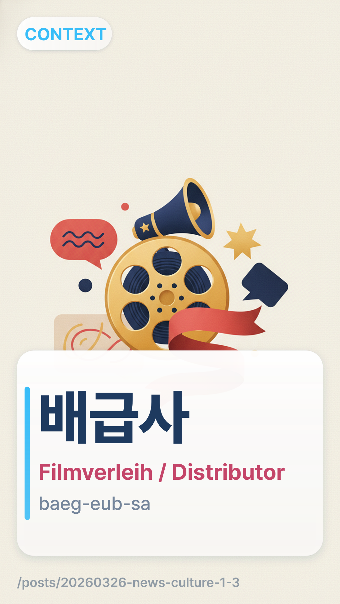 Im Kontext der koreanischen Unterhaltungsindustrie ist ein 배급사baegeupsa (baeg-eub-sa) ein Filmverleih (Distributor). Sie sind das Bindeglied zwischen der Produktionsfirma und den Kinos und kümmern sich um Marketing, Terminplanung sowie die physische/digitale Lieferung des Films an die Leinwände.