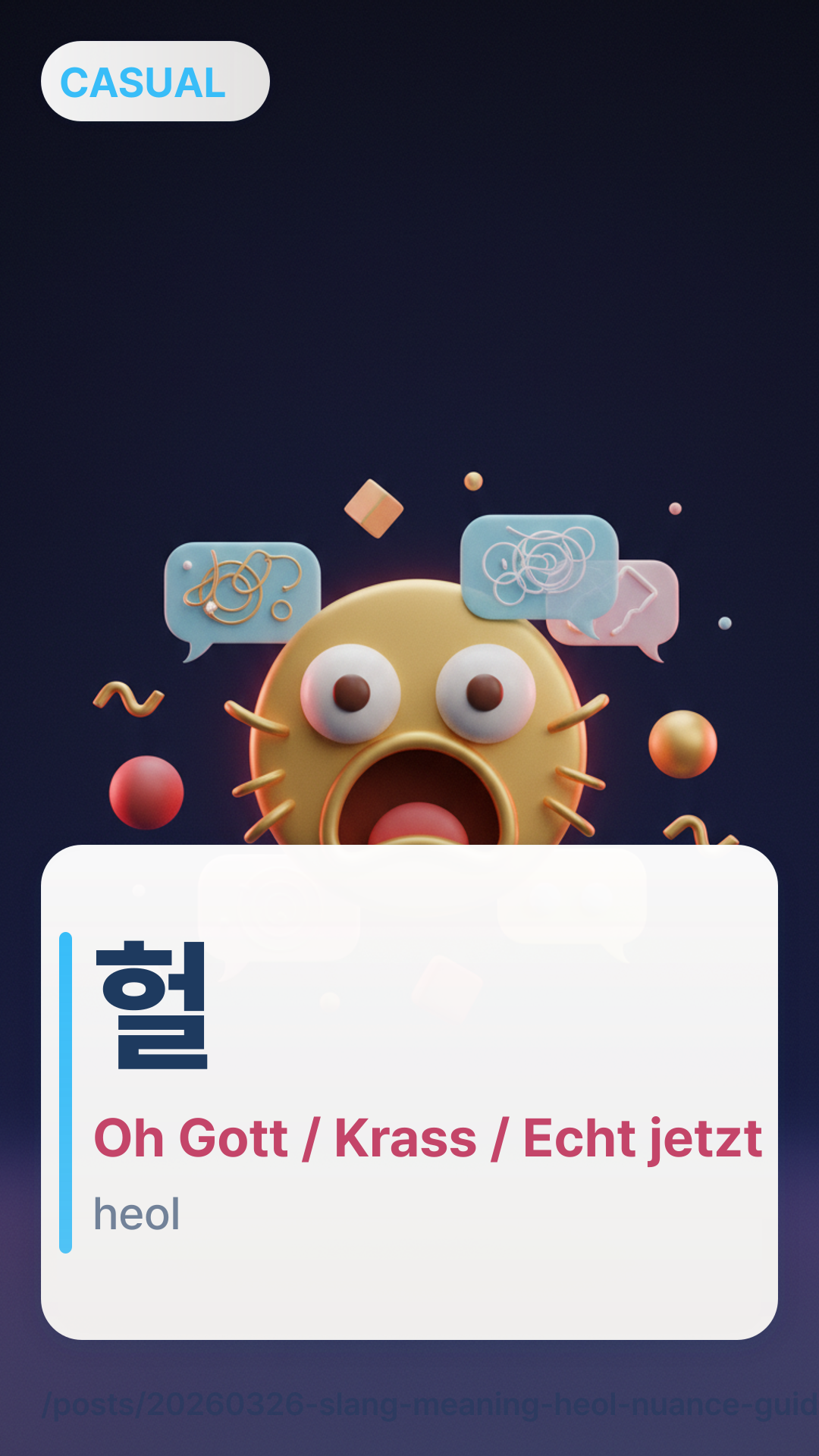 헐heol (Heol) ist ein vielseitiger Ausruf, der verwendet wird, um einen plötzlichen Emotionsumschwung auszudrücken – meist Schock, Enttäuschung oder Unglauben. Es gibt keine direkte Wörterbuchdefinition, da es wie ein emotionales „Nach-Luft-Schnappen“ in Wortform funktioniert. Je nachdem, wie lange man den Vokal dehnt (허어어얼~heoeoeoeol~), kann es von echter Überraschung bis hin zu tiefer Verärgerung oder sogar beißendem Sarkasmus reichen.