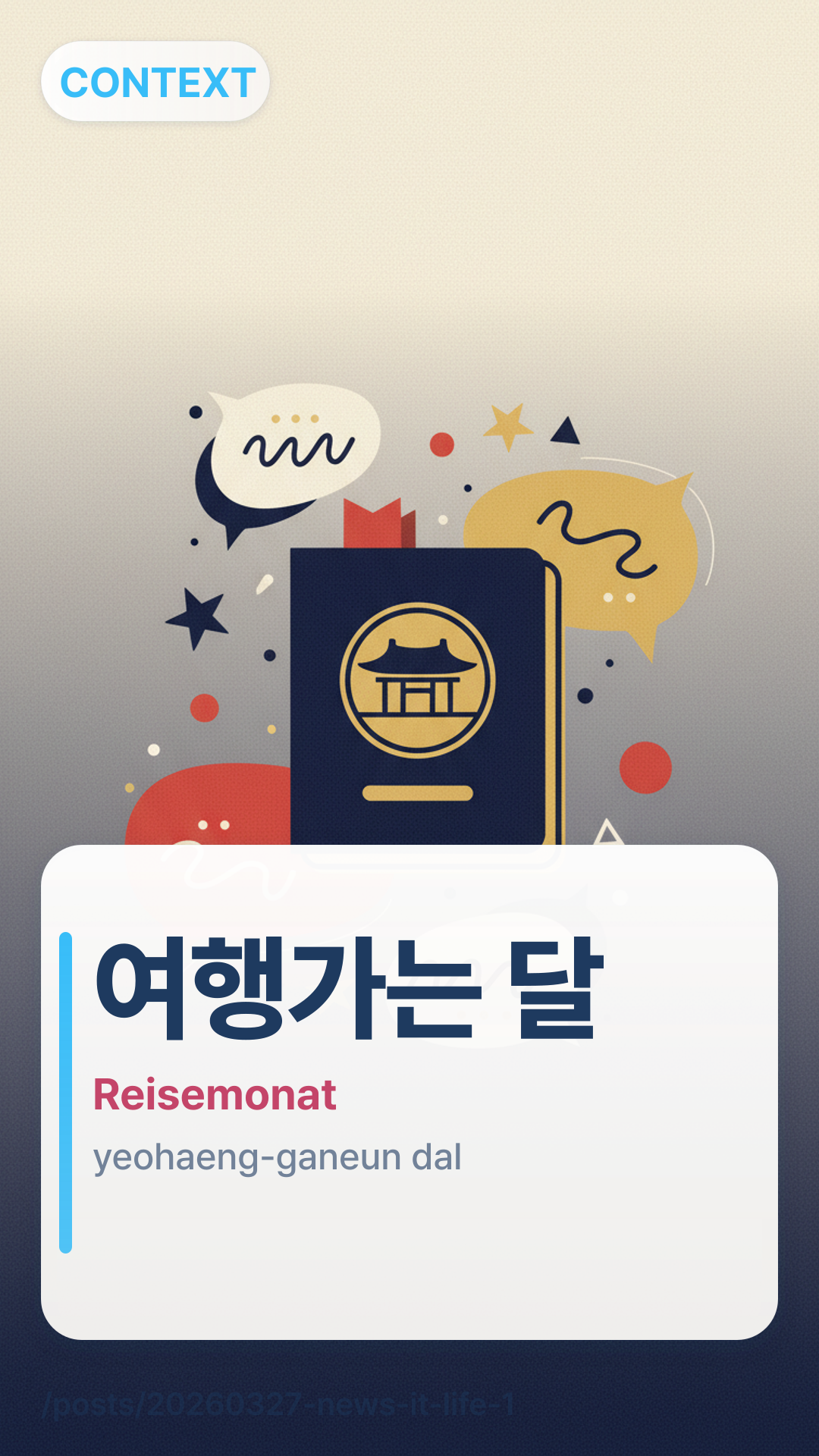 여행가는 달yeohaengganeun dal (Yeohaeng-ganeun Dal) lässt sich wörtlich als "Der Monat, in dem man auf Reisen geht" übersetzen. In diesem Kontext bezieht es sich auf den spezifischen, von der Regierung festgelegten Zeitraum, in dem nationale Reiserabatte und Veranstaltungen konzentriert sind.