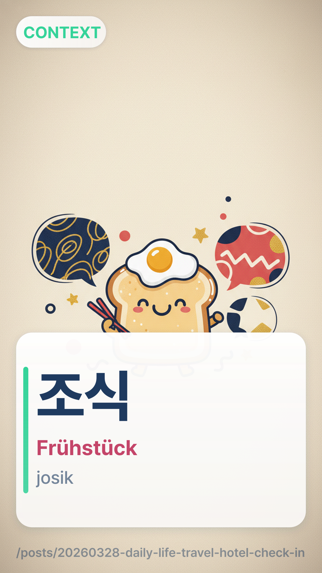 아침 식사조식josik아침achim (Morgen/Frühstück) ist für lockere Gespräche in Ordnung, aber verwenden Sie 조식josik gegenüber dem Personal, um vorbereiteter zu klingen.