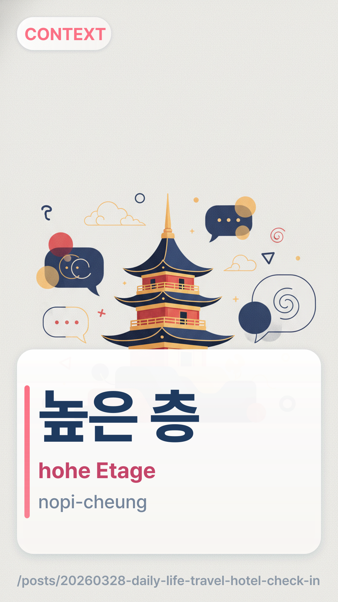 조식josik bezieht sich speziell auf die Frühstücksmahlzeit im Hotel.체크인chekeuin ist das Substantiv für den Prozess der Anmeldung im Hotel bei der Ankunft.높은 층nopeun cheung ist die Standardanfrage für Gäste, die eine bessere Aussicht oder weniger Lärm wünschen.Wenn Sie mit dem Hotelpersonal sprechen, ist die Endung -요-yo absolut sicher und höflich. Sie werden jedoch bemerken, dass das Personal oft im sehr formellen -습니다-seupnida-Stil antwortet. Fühlen Sie sich nicht unter Druck gesetzt, deren Förmlichkeit perfekt zu erwidern; bei -요-yo zu bleiben ist für Reisende natürlich. Achten Sie auf Schilder im Aufzug, die die 이용 시간iyong sigan für die Sauna oder die Rooftop-Bar auflisten!