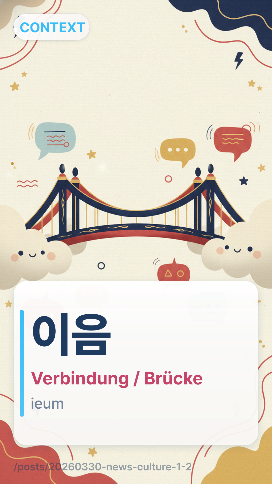이 축제는 전통과 현대의 이음을 목표로 합니다.i chukjeneun jeontonggwa hyeondaeui ieumeul mokpyoro hapnida. — Dieses Festival zielt darauf ab, eine Brücke zwischen Tradition und Moderne zu schlagen.