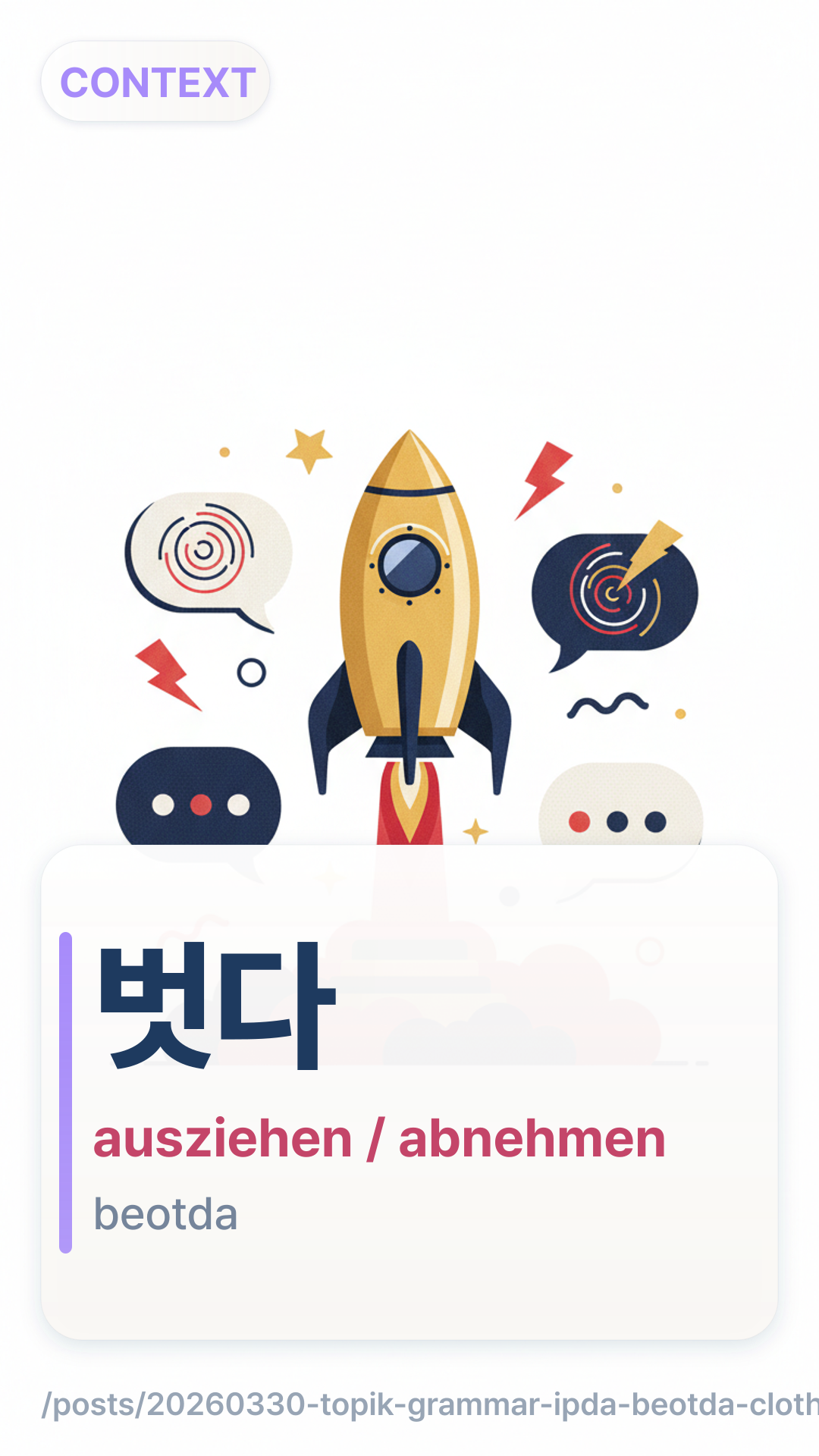 Im Gegensatz zu den Verben für „tragen“, die sehr spezifisch sind, ist 벗다beotda das universelle Verb für das „Ausziehen“ oder „Abnehmen“ von allem am Körper. Egal ob Hut, Schuhe, Hemd oder sogar Brille – man verwendet 벗다beotda.