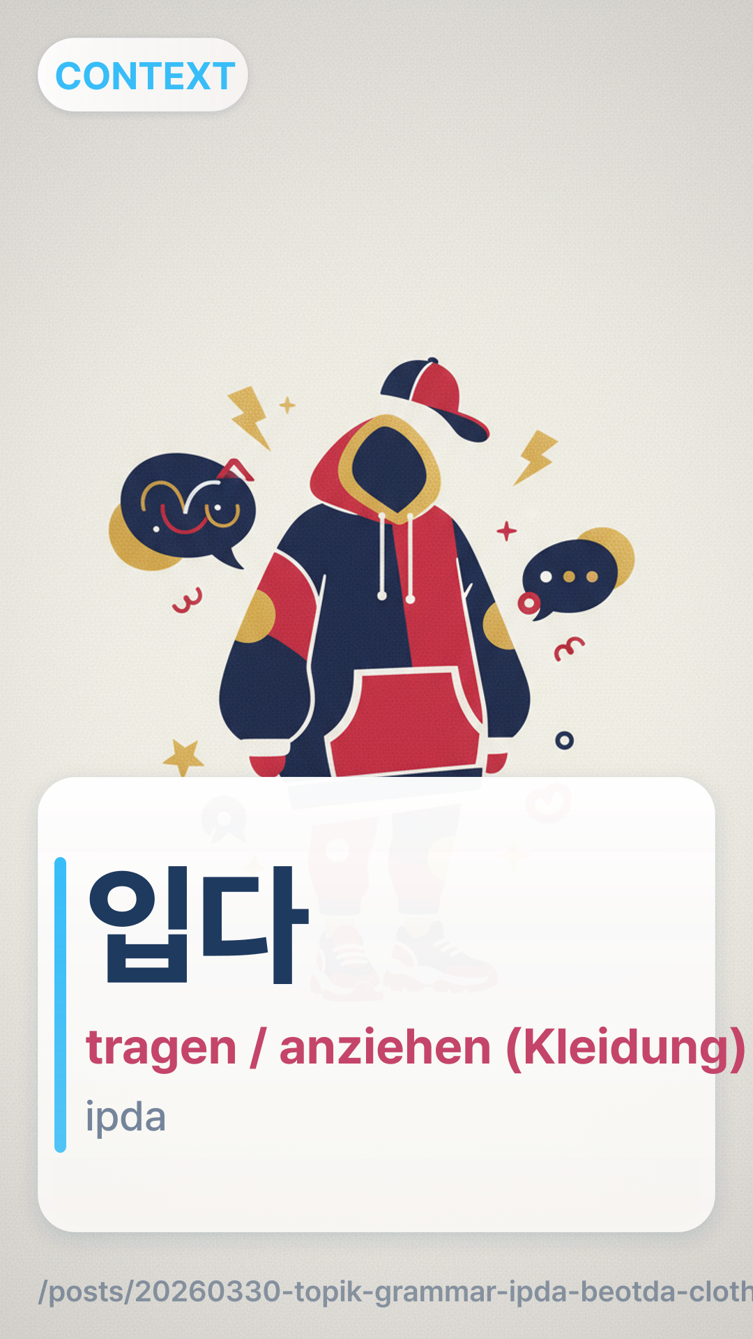 입다ipda wird ausschließlich für das „Anziehen“ oder „Tragen“ von Gegenständen verwendet, die den Rumpf oder die Beine bedecken. Dazu gehören T-Shirts, Pullover, Röcke, Hosen und Kleider. Es wird NICHT für Dinge verwendet, die man auf dem Kopf, an den Händen oder an den Füßen trägt.