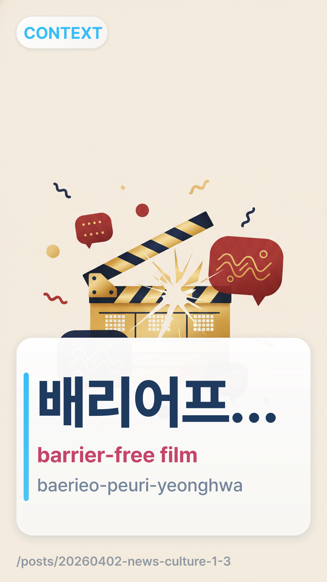EN brief: 수원시미디어센터-배리어프리영화위원회 업무협약 체결, ‘누구나 함께 보는 영화’ 문화 확산 나선다 (culture) + 1 glossary term.