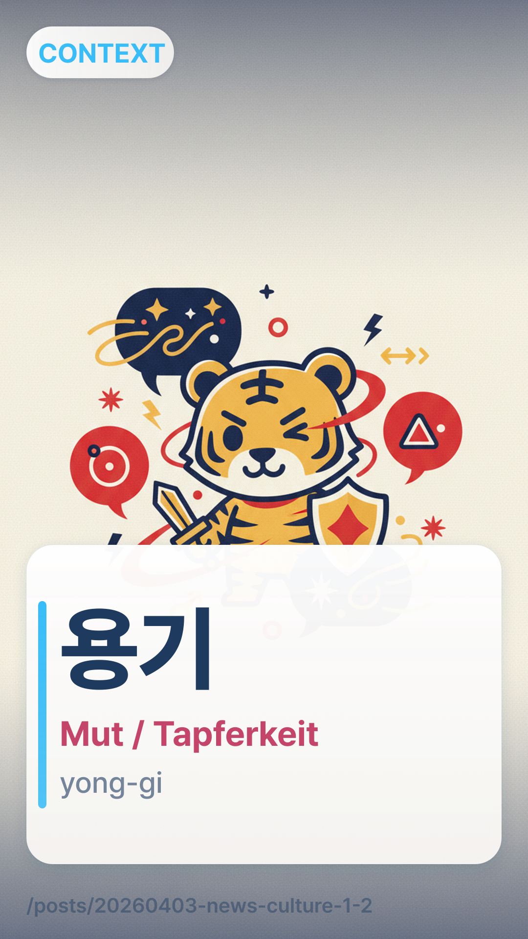 Im Kontext des Artikels bezieht sich 용기 (Yong-gi) auf den Mut oder die Tapferkeit, die erforderlich ist, um verletzlich und ehrlich zu sein. Während es physische Tapferkeit bedeuten kann, bezeichnet es hier speziell die spirituelle Stärke, sein wahres Selbst zu offenbaren.