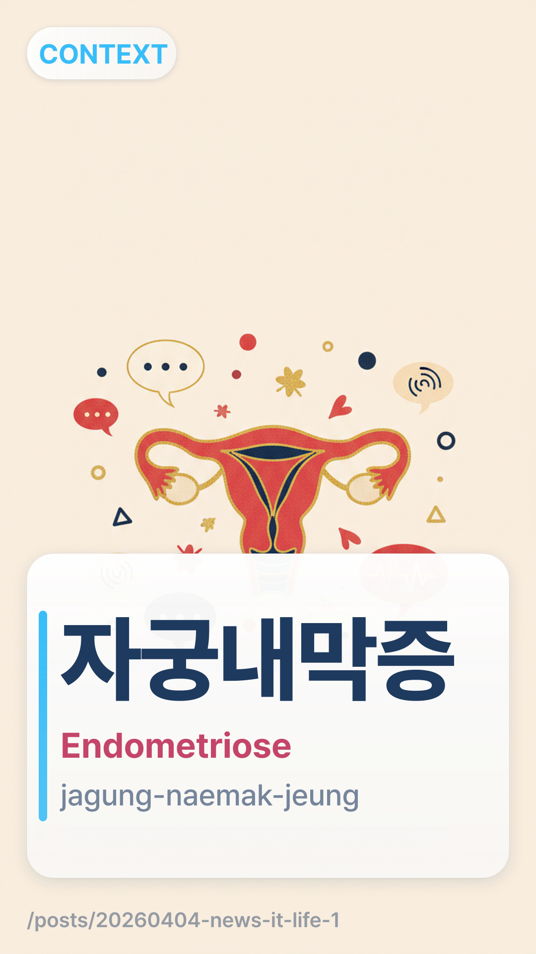 자궁내막증jagungnaemakjeung (Jagung-naemak-jeung) bezieht sich auf Endometriose, eine medizinische Erkrankung, bei der Gewebe, das der Gebärmutterschleimhaut ähnelt, außerhalb der Gebärmutter wächst. Es wird im Artikel als primäres Beispiel für eine Krankheit angeführt, deren Diagnose durchschnittlich 7 Jahre dauert.