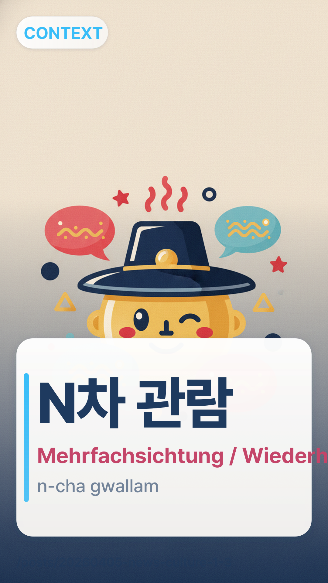 N차 관람Ncha gwanram (N-cha gwallam) bezieht sich auf den Akt, denselben Film mehrmals im Kino anzusehen. Das 'N' steht für eine algebraische Variable für eine beliebige Zahl, und 'cha' ist ein Zählwort für 'Male' oder 'Runden'. Es ist ein gängiger Begriff in der koreanischen Fandom-Kultur, um 'Wiederholungssichtungen' oder 'Mehrfachbesuche' zu beschreiben.