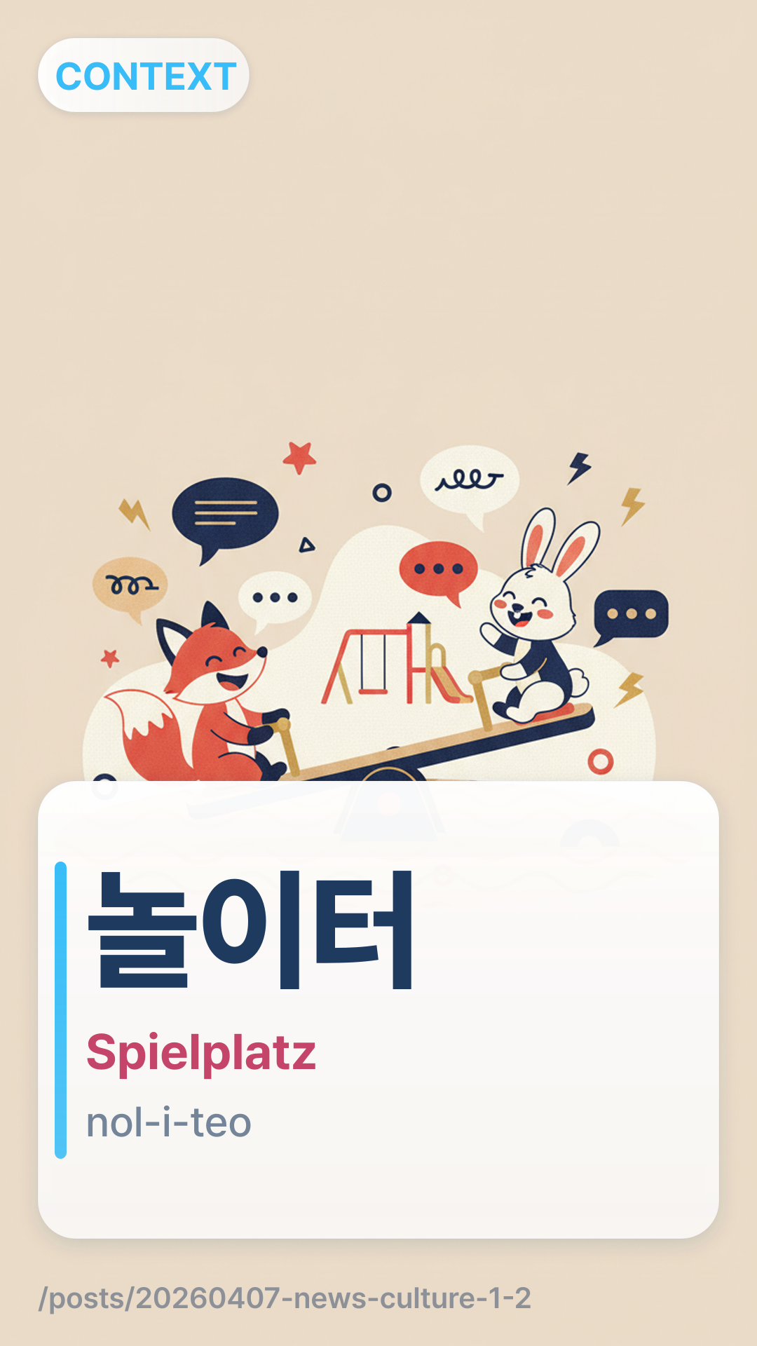Im Kontext dieser Nachricht bezieht sich 놀이터 (nol-i-teo) auf einen "Spielplatz". Während es wörtlich einen physischen Ort mit Schaukeln und Rutschen bedeutet, wird es in der digitalen Welt verwendet, um einen sicheren, unterhaltsamen und interaktiven Raum zu beschreiben, in dem Nutzer (insbesondere Kinder) mit Inhalten "spielen" können.