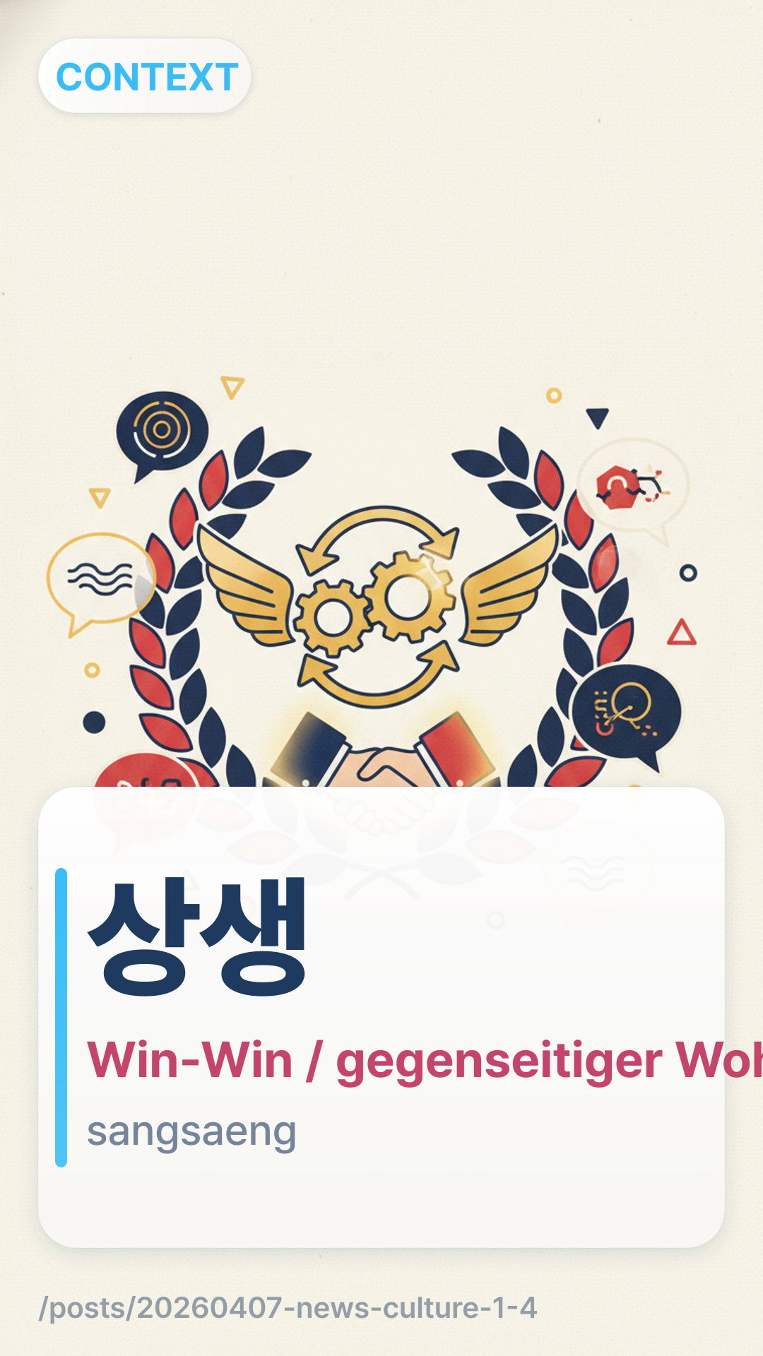 Achten Sie beim Lesen koreanischer Nachrichten auf den Begriff 상생sangsaeng in Schlagzeilen zu Wirtschaft oder Kultur. Er signalisiert normalerweise eine positive Zusammenarbeit oder eine staatlich geleitete Initiative zur Unterstützung kleinerer Marktteilnehmer. Um natürlich zu klingen, verwenden Sie ihn bei der Diskussion von Partnerschaften, von denen alle Beteiligten profitieren.