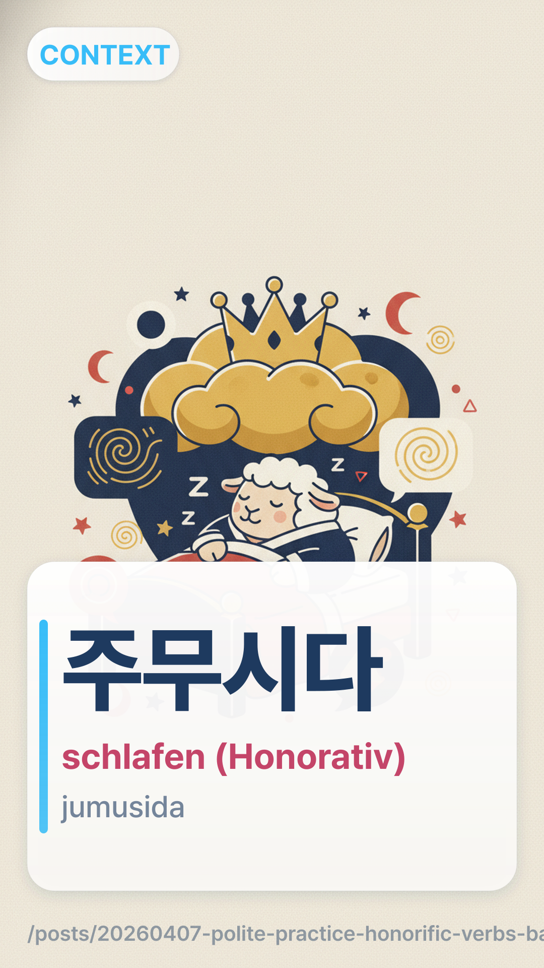Lerne wichtige koreanische Honorativverben wie 주무시다 und 드시다. Meistere höfliche Sprache mit unserer Tonleiter und Schreibübungen. Sprich natürlicher!