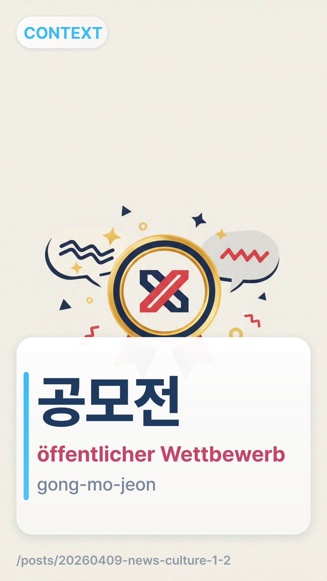 공모전gongmojeon (gong-mo-jeon) bezieht sich auf einen öffentlichen Wettbewerb oder eine Wettbewerbsausstellung, bei der die breite Öffentlichkeit eingeladen ist, Beiträge wie Kunst, Essays oder Filme einzureichen, die für Preise bewertet werden.