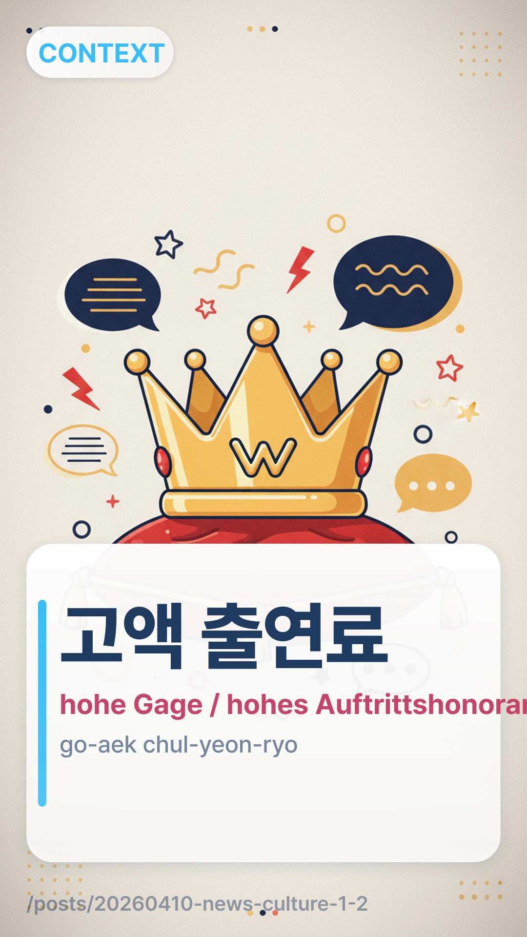 고액 출연료goaek churyeonryo (go-aek chul-yeon-ryo) bezieht sich auf „hohe Auftrittshonorare“ oder außergewöhnlich hohe Gehälter, die an Darsteller gezahlt werden, typischerweise an Hauptdarsteller in Dramen oder Filmen. Im aktuellen koreanischen Medienkontext weist es speziell auf den durch globale OTT-Plattformen verursachten Inflationstrend hin.