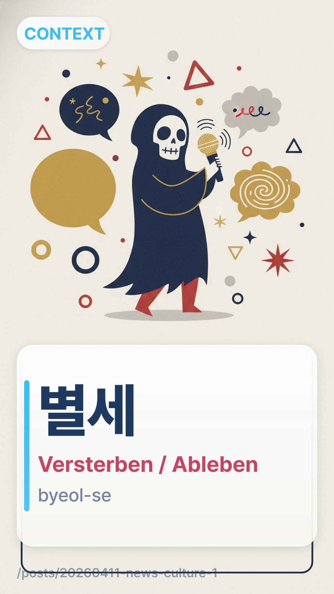 별세byeolse (byeol-se) ist eine formelle, respektvolle Art, "Versterben" oder "Tod" zu sagen, die typischerweise für ältere Menschen oder hoch angesehene Personen verwendet wird. Wörtlich übersetzt bedeutet es "die Welt verlassen".