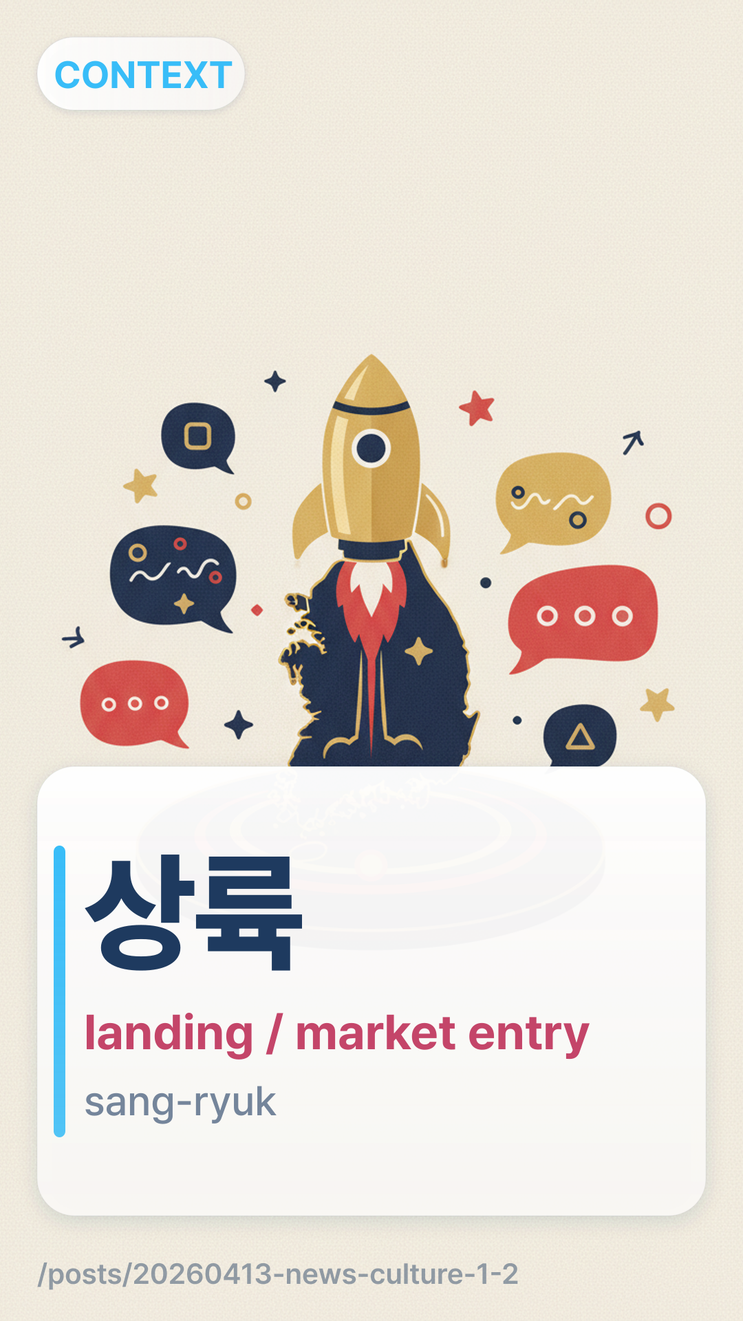 Im Kontext von Nachrichten und Wirtschaft bedeutet 상륙sangryuk (sang-ryuk) wörtlich „Landung“ (wie ein Boot, das das Ufer erreicht), wird aber am häufigsten verwendet, um eine ausländische Marke, ein Produkt oder eine Technologie zu beschreiben, die offiziell in den koreanischen Markt eintritt.