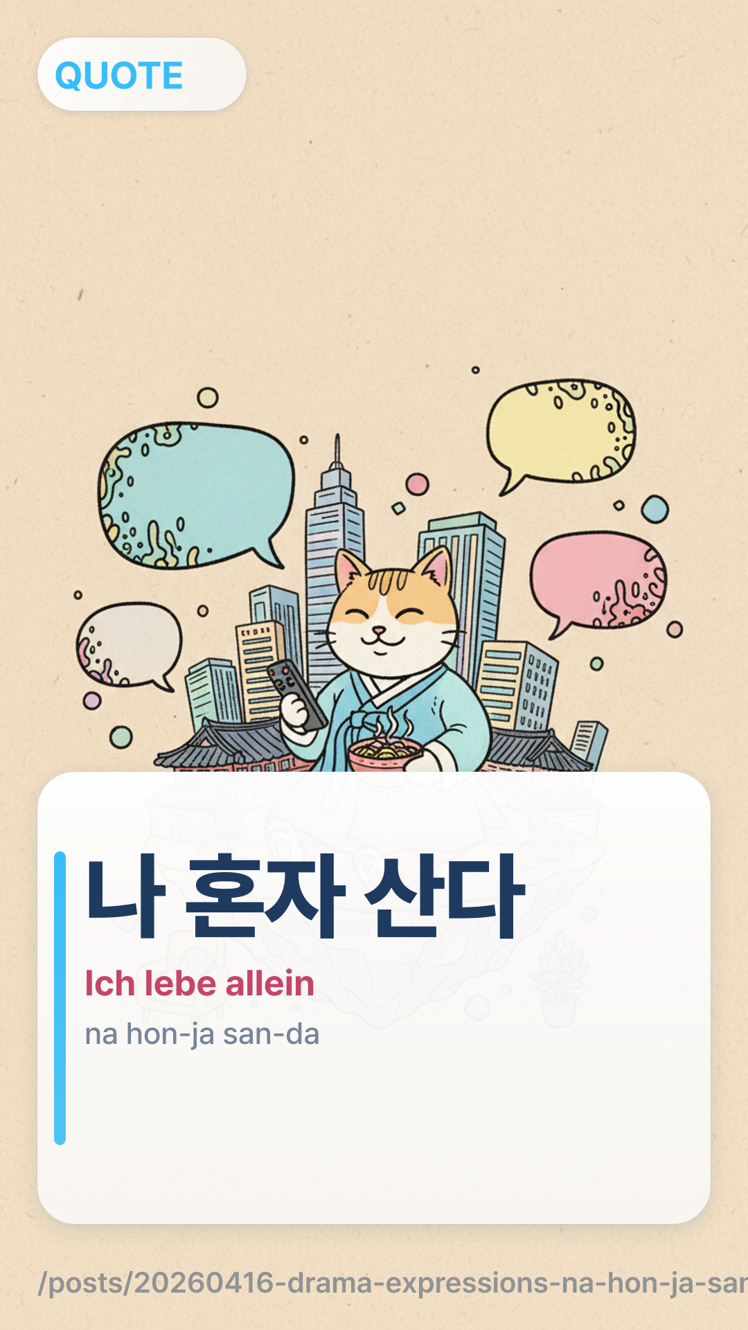 나 혼자 산다na honja sanda (5/5 Unabhängigkeit) – Stolz, aktiv, autark.혼자 있다honja itda (3/5 Neutral) – Einfach im Moment allein sein.쓸쓸히sseulsseulhi (1/5 Einsamkeit) – Traurig, trostlos oder sich verlassen fühlend.혼자honja (Honja).외롭게oeropge (Oeropge).쓸쓸히sseulsseulhi (Sseulsseulhi).외로워요oerowoyo.나 그냥 혼자 살아.na geunyang honja sara. — Ich lebe einfach allein.저 혼자 살고 있어요.jeo honja salgo isseoyo. — Ich lebe (gerade) allein.1인 가구가 증가하고 있습니다.1in gaguga jeunggahago itseupnida. — Einpersonenhaushalte nehmen zu.요즘 나 혼자 산다 찍는 기분이야.yojeum na honja sanda jjikneun gibuniya. — Heutzutage fühle ich mich, als würde ich „I Live Alone“ drehen.혼자 사는 게 생각보다 편해요.honja saneun ge saenggakboda pyeonhaeyo. — Allein zu leben ist bequemer, als ich dachte.Versuchen Sie, heute die Vorsilbe 혼-hon- (hon) für Ihre Aktivitäten zu verwenden. Wenn Sie allein in ein Café gehen, sagen Sie einem Freund 나 오늘 혼커(혼자 커피) 했어!na oneul honkeo(honja keopi) haesseo!, um den Vibe stolzer Unabhängigkeit zu üben.
