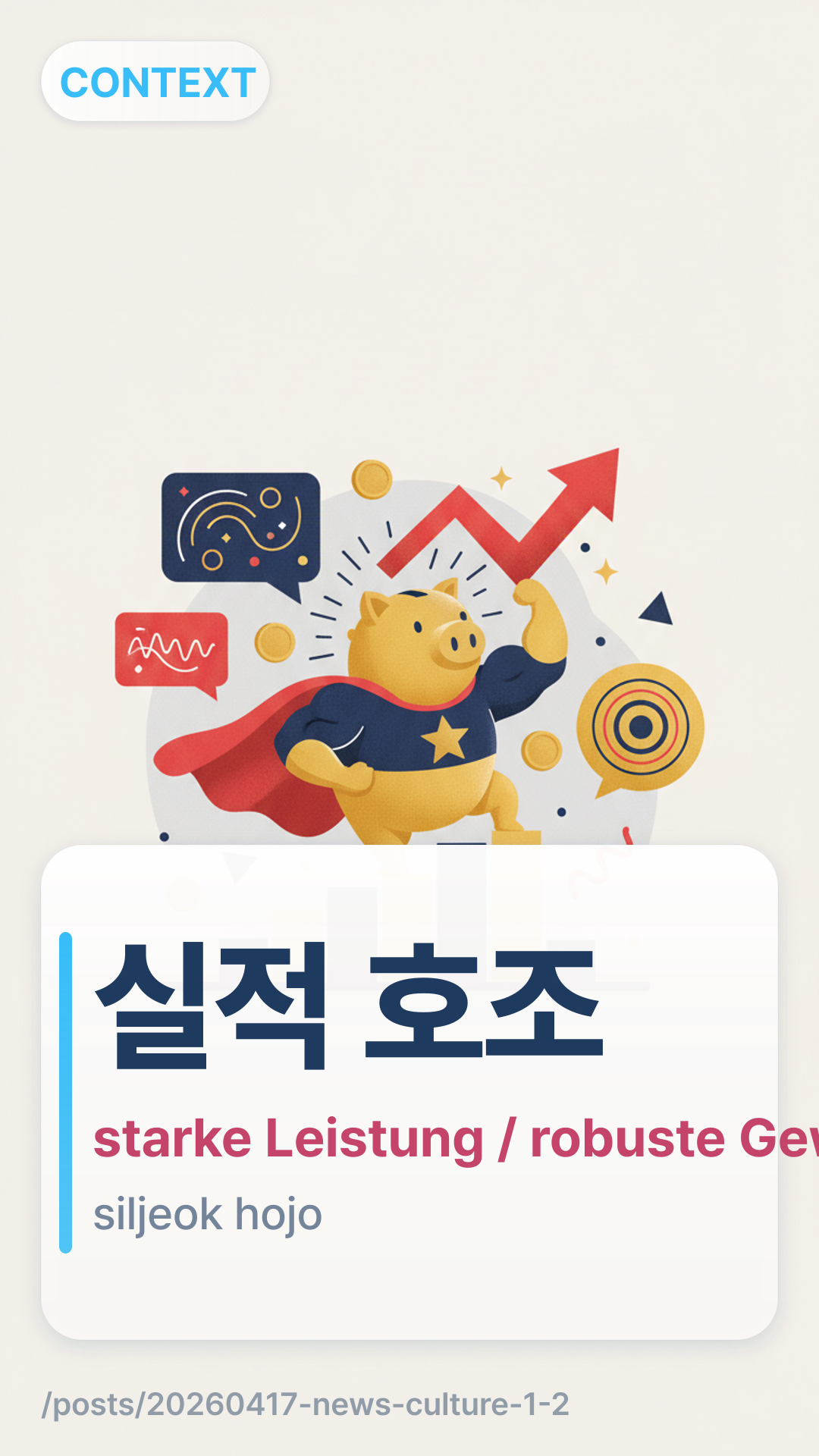 실적 호조 (sil-jeok ho-jo) bezieht sich auf eine Situation, in der die Geschäftsleistung oder die Finanzergebnisse eines Unternehmens deutlich besser als erwartet oder besser als in vorangegangenen Zeiträumen ausfallen. Es ist ein formeller Begriff, der häufig in Wirtschaftsnachrichten und Unternehmensberichten verwendet wird.