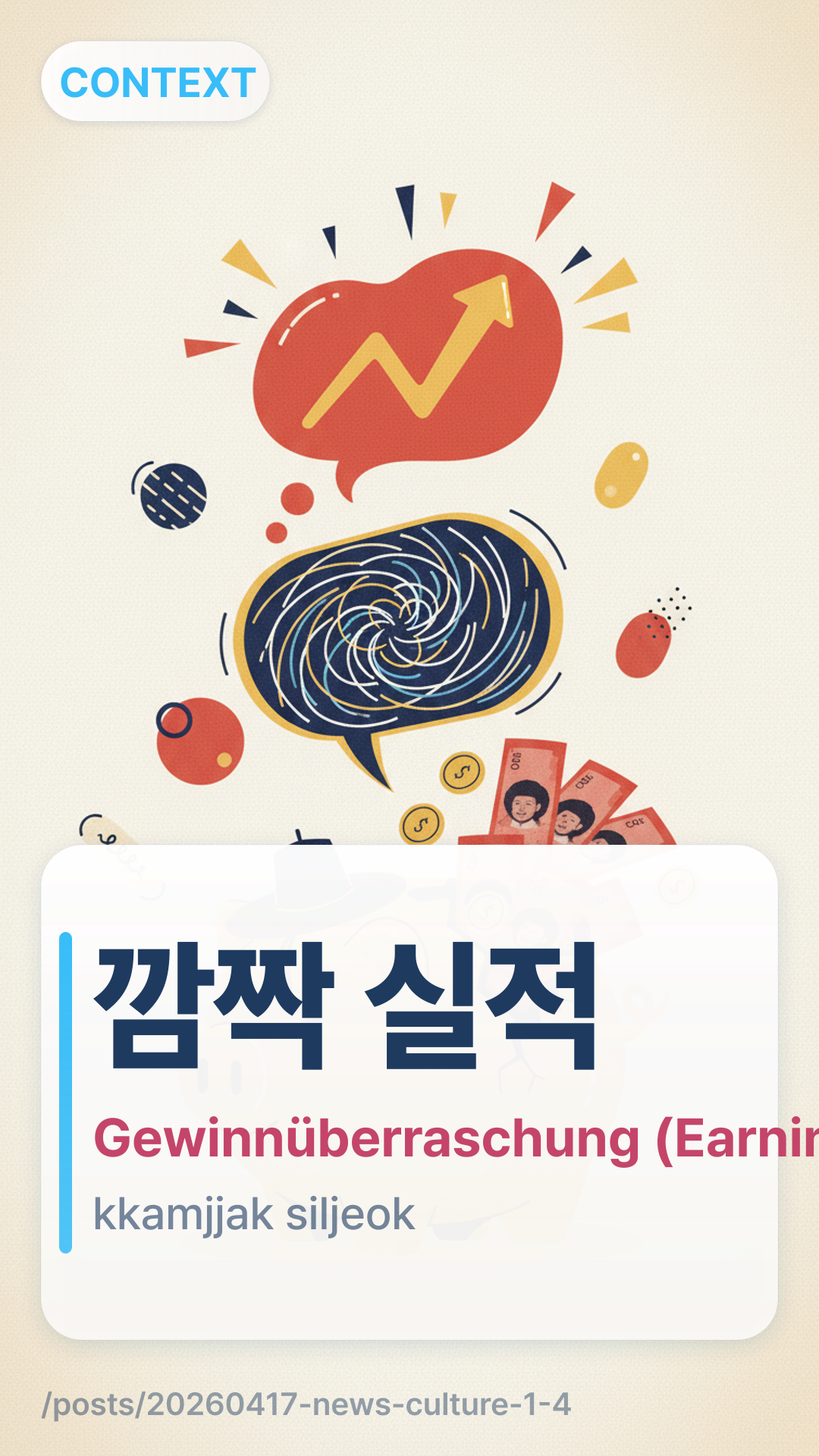 Dieser Begriff wird in den koreanischen Finanznachrichten häufig verwendet, um eine „Gewinnüberraschung“ (Earnings Surprise) zu beschreiben. Er kombiniert das Wort (überraschend/erschreckend) mit (Leistung/Ergebnisse) und bezieht sich auf eine Situation, in der der Finanzbericht eines Unternehmens viel besser ausfällt als der Marktkonsens.