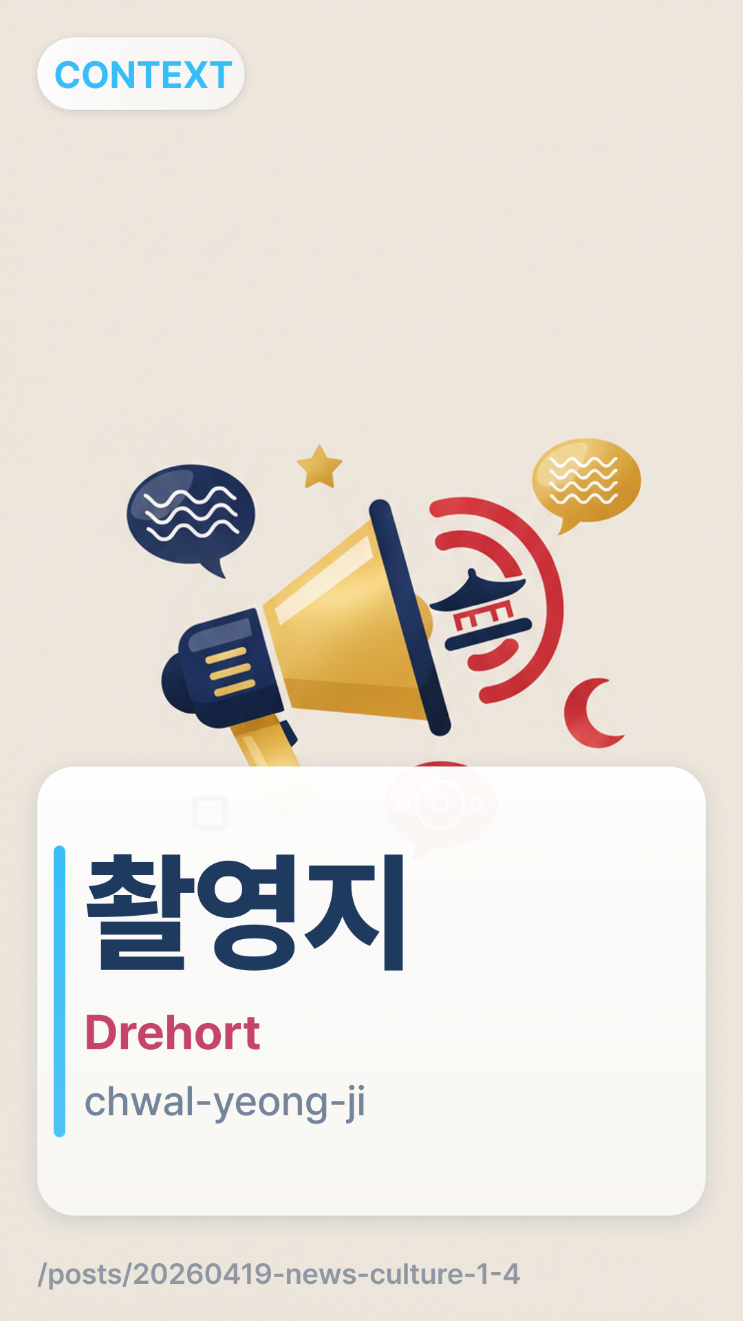 (Chwal-yeong-ji) bezieht sich auf einen „Drehort“ oder „Aufnahmeort“. Es ist ein zusammengesetztes Wort aus (Filmen/Aufnahme) und (Ort/Land). Im Kontext von Hallyu werden diese Orte oft zu großen Touristenattraktionen, nachdem ein Drama oder ein Film zum Hit geworden ist.