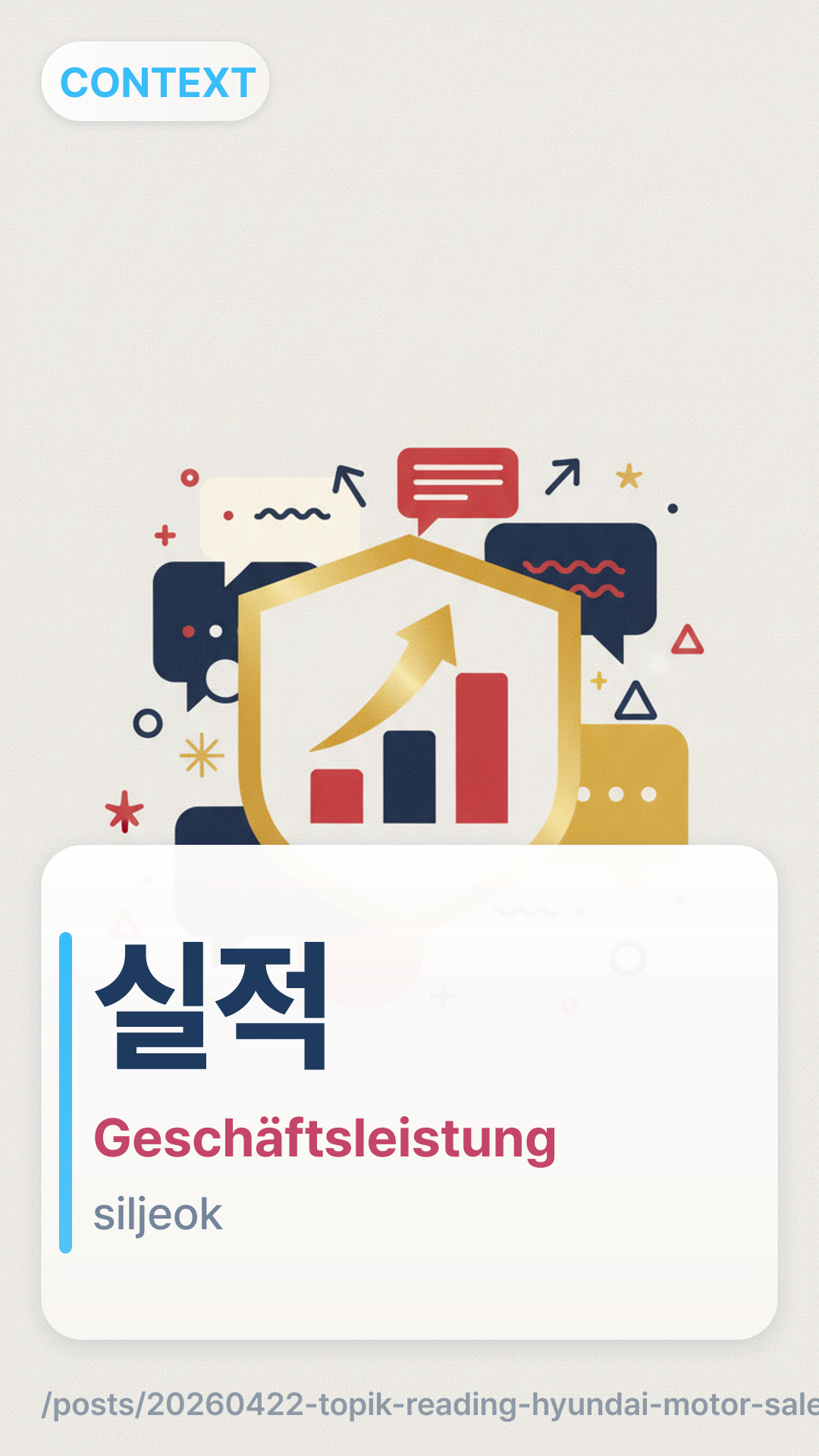 Meistern Sie 실적, 점유율 und 달성, um die globalen Meilensteine von Hyundai Motor zu verstehen. Lernen Sie wichtiges koreanisches Wirtschaftsvokabular und TOPIK-Lesetipps.