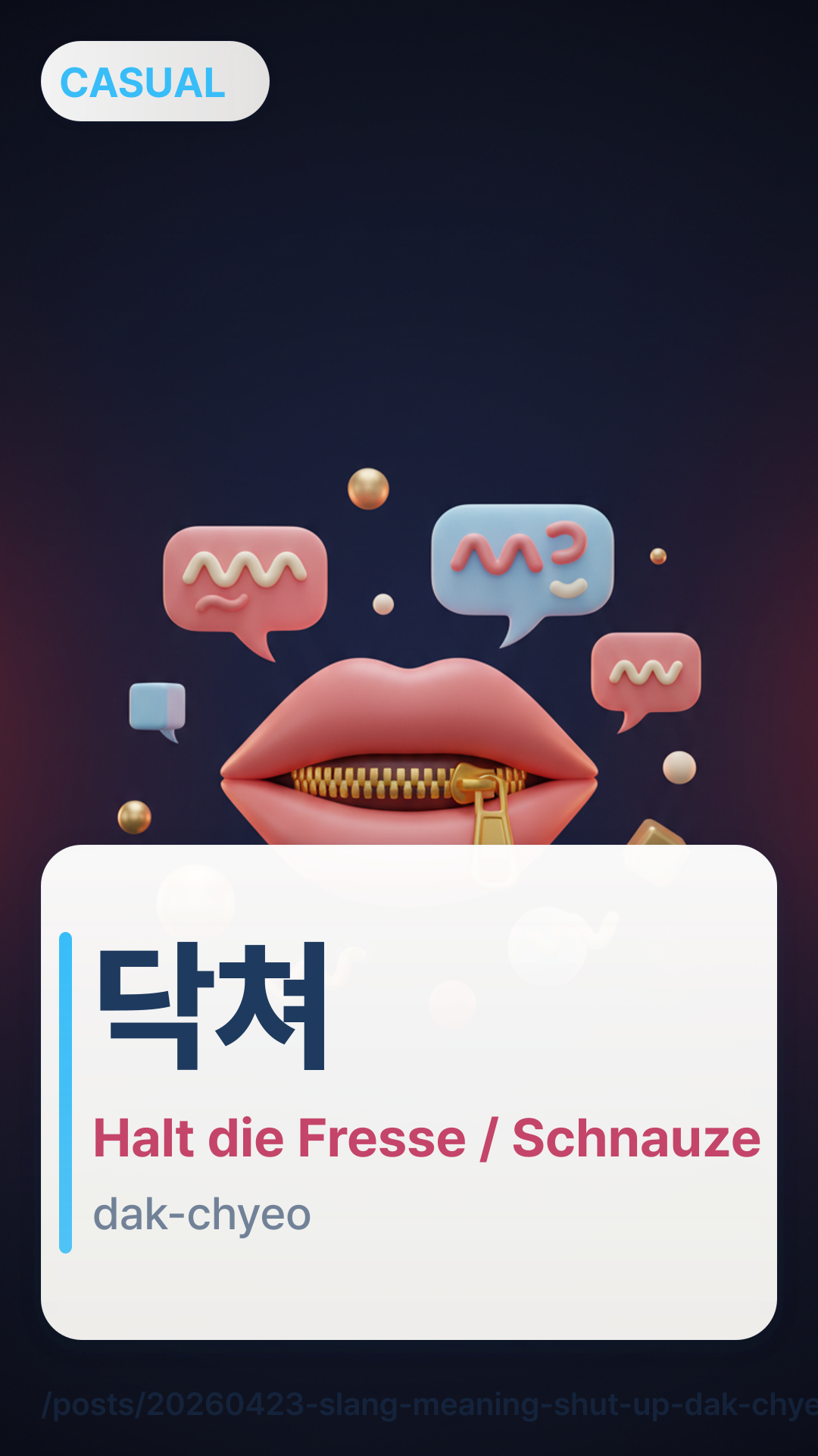 Lerne die Bedeutung von 닥쳐 (Dak-chyeo) und 입 다물어 kennen. Meistere koreanischen Slang für 'Halt den Mund' mit Höflichkeitsstufen und sicheren Alternativen.