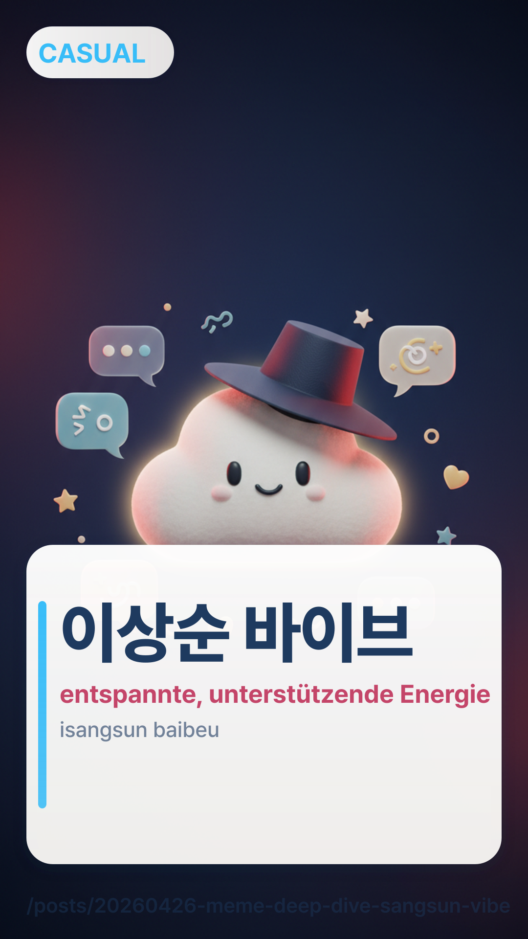 Meistern Sie das Meme 'Lee Sang-sun Vibe' (이상순 바이브). Lernen Sie, wie man die perfekte entspannte und unterstützende Energie auf Koreanisch beschreibt.