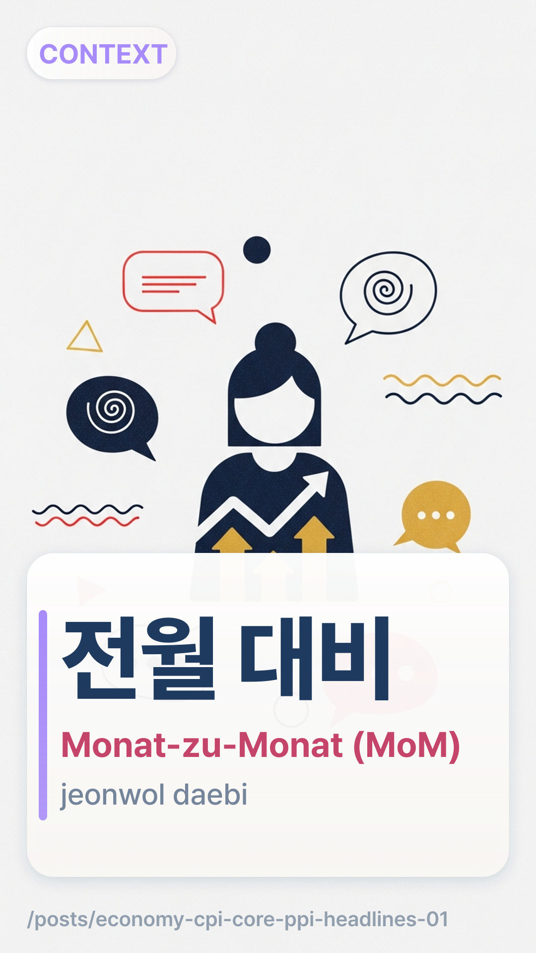 전월 대비 0.2% 상승으로 집계됐다.jeonwol daebi 0.2% sangseueuro jipgyedwaetda. — Es wurde als +0.2% im Monatsvergleich erfasst.전월 대비는 작아 보여도 전년 대비는 클 수 있다.jeonwol daebineun jaga boyeodo jeonnyeon daebineun keul su itda. — MoM kann klein wirken, während YoY groß ist.전월 대비 하락은 ‘이번 달이 지난달보다 싸졌다’는 뜻이다.jeonwol daebi harageun ‘ibeon dari jinandalboda ssajyeotda’neun tteusida. — Ein MoM-Rückgang bedeutet: Dieser Monat ist günstiger als der letzte.