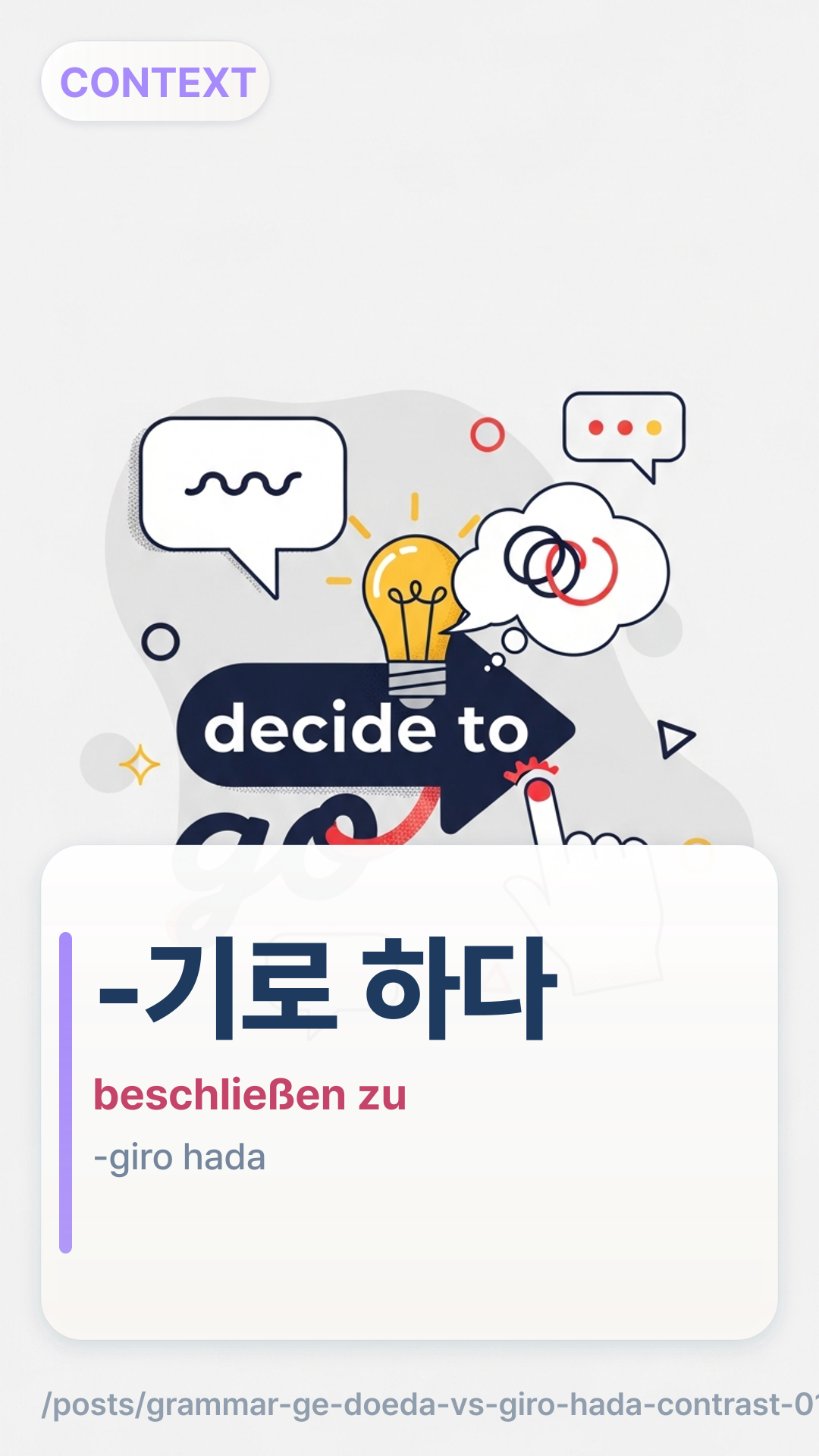 Vermittle -게 되다-ge doeda vs -기로 하다-giro hada mit einem Agency-Meter (Wahl→Umstände) und Triggerwörtern (결국/어쩌다) – und übe dann 12 Chat-Style-Rewrites.