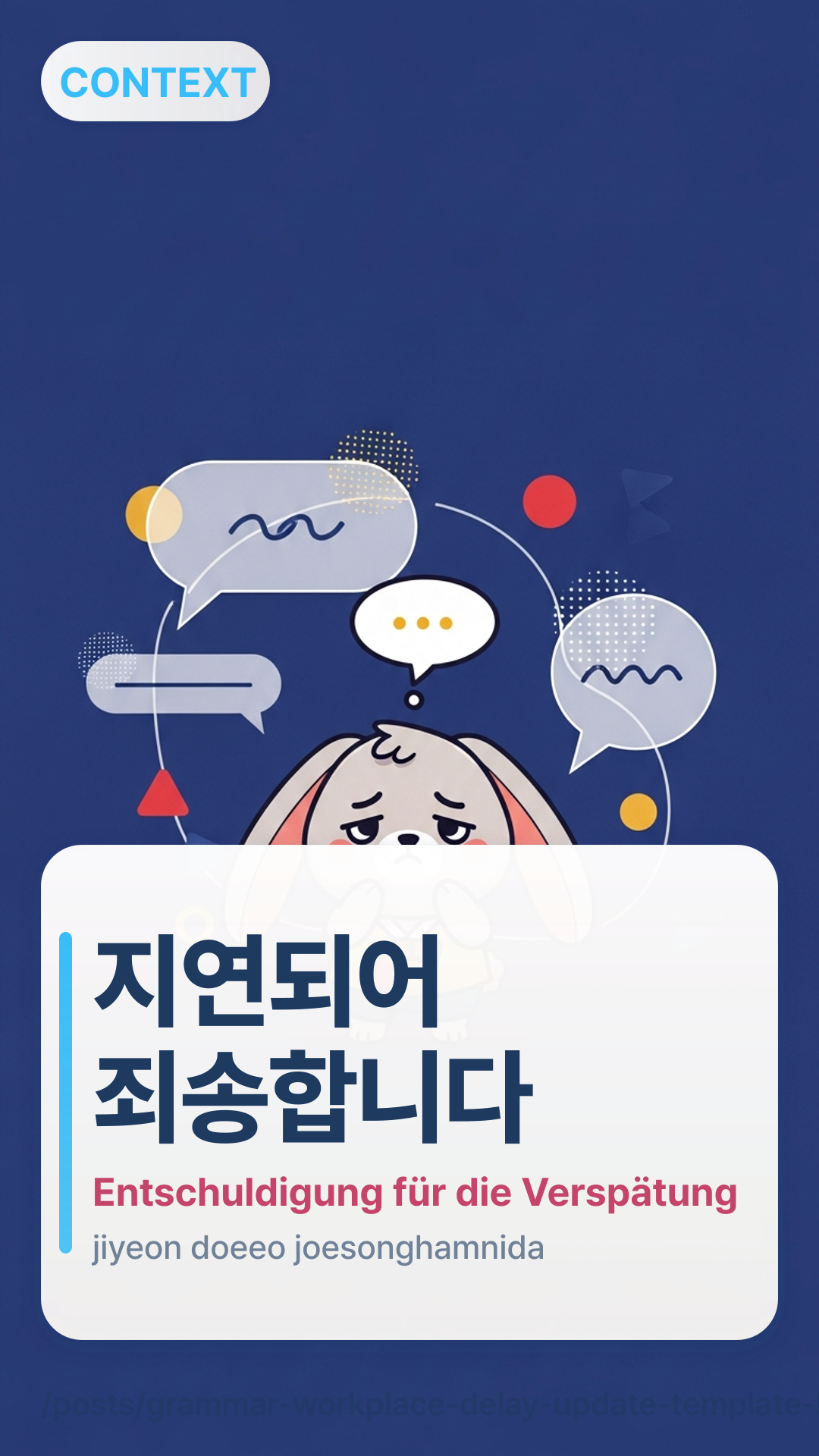 Lehrt Verzugs-Updates mit einer Entschuldigung→Plan→ETA-Vorlage, die vorwurfsvoll klingende Ausreden verhindert und zu konkreten Zeitangaben (까지/전/내) zwingt.
