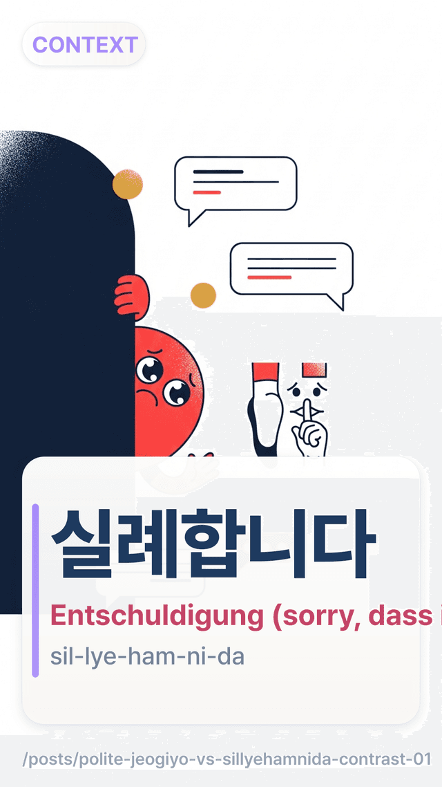 Nutze 저기요jeogiyo, um die Aufmerksamkeit von jemandem zu bekommen (besonders wenn es dringend ist oder die Person nicht hinschaut); nutze 실례합니다silryehapnida, wenn du unterbrichst oder dich vorbeischiebst und dabei formeller rücksichtsvoll klingen willst.